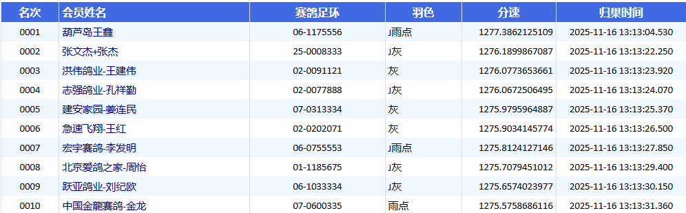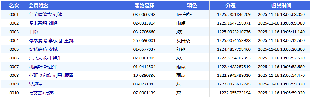 更令人赞叹的是,这位鸽主的优秀赛绩远不止于此。同日,在1号棚预赛中,其名下另一羽07-0001139灰鸽再传捷报,以1222.0557米/分的分速强势杀入前十,荣获第十名。