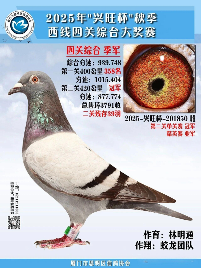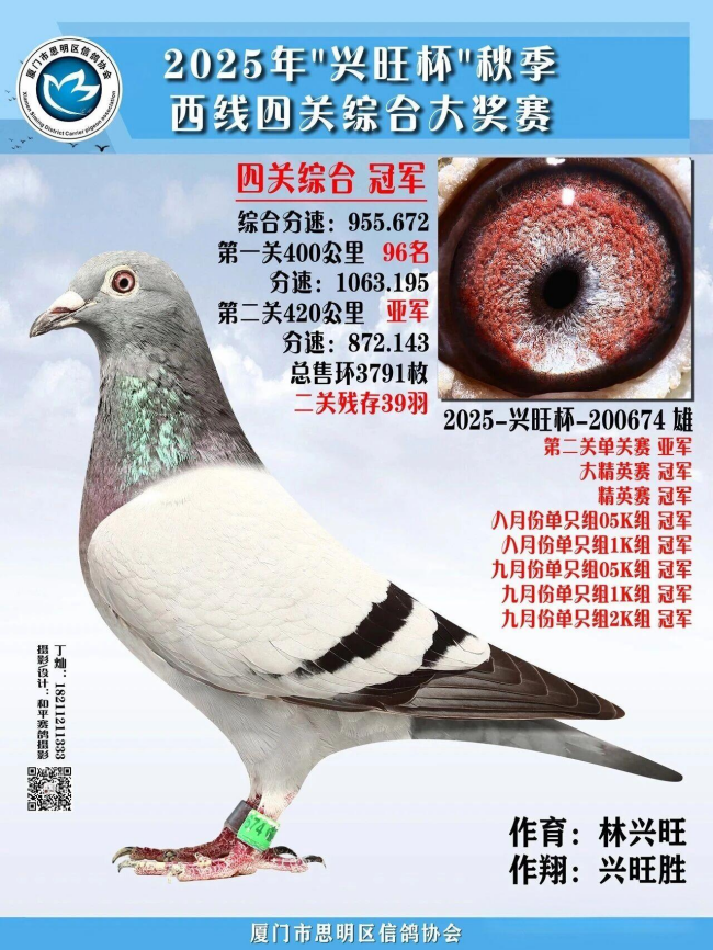 不过,也有小将用自己过硬的实力,战胜所有艰难成功归来。兴旺胜团队的表现在本届秋赛中十分突出,其麾下一羽2025-兴旺杯-200674,凭借一关96名,二关亚军,综合分速955.672米/分的成绩获得鸽王冠军。此外,该团队还在一关的比赛中包揽了冠亚军,获得多个高位名次,实力恐怖。