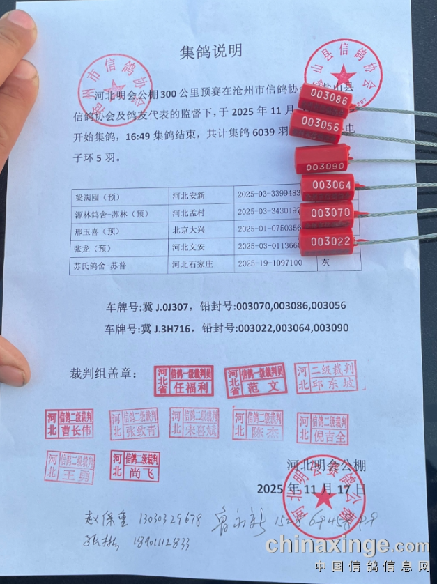 11月18日7点38分,河北明会赛鸽公棚预赛正式开笼,共计集鸽6039羽。本关比赛司放地为河南省濮阳县,实际空距304.405公里,当日天气晴好。据悉,2025年为该公棚的第七届秋赛,共收鸽13163羽,参赛费为1580元/羽。赛事设三关正赛,赛程分为180公里首关、304公里二关、500-520公里三关。