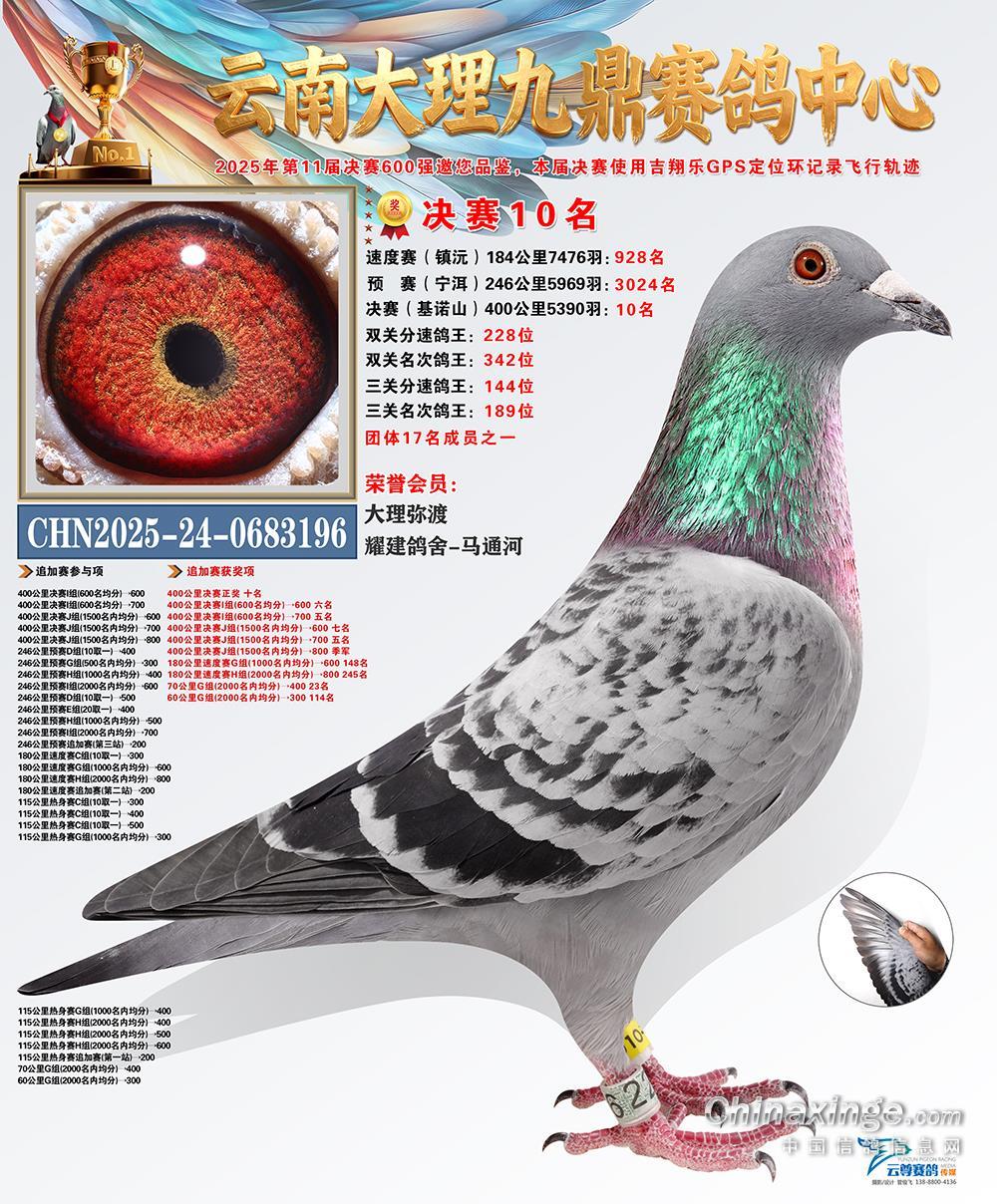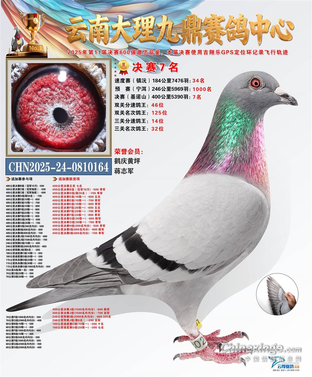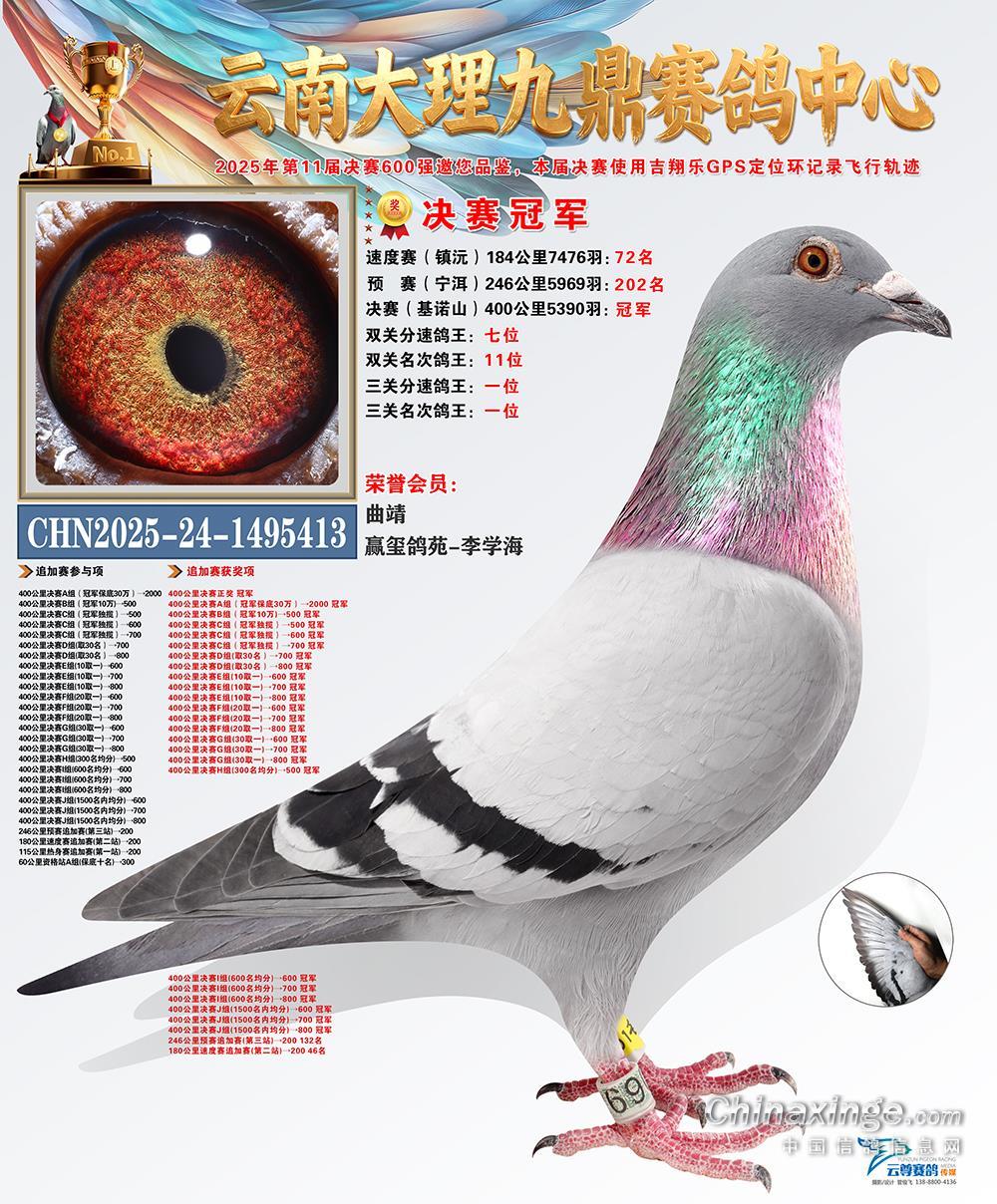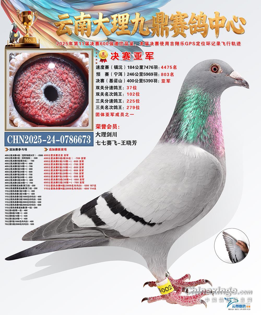 关关试炼砺好鸽,场场拼搏真英雄。云南九鼎赛鸽中心2025年秋赛已落下帷幕,作为已举办十一届比赛的老棚,九鼎赛鸽今年的秋赛可谓燃爆西南,不负众望!十一载深耕不辍、十一载口碑如金。从收鸽1.2万羽,到决赛归巢三千余羽,全程精彩无限。最终鸽友赢玺鸽苑-李学海麾下一羽2025-24-1495413灰鸽,将本届决赛冠军荣耀收入囊中!同时,这羽灰鸽凭借速度赛72名,预赛202名,决赛冠军的优异表现,荣耀加冕三关鸽王冠军,双冠在手,实力非凡!九鼎始终以专业立棚、公平为魂的初心,全程智慧眼监督,决赛配对定位脚环,努力办好赛事,在彩云之南的红土高原上,书写着赛鸽运动的热血。