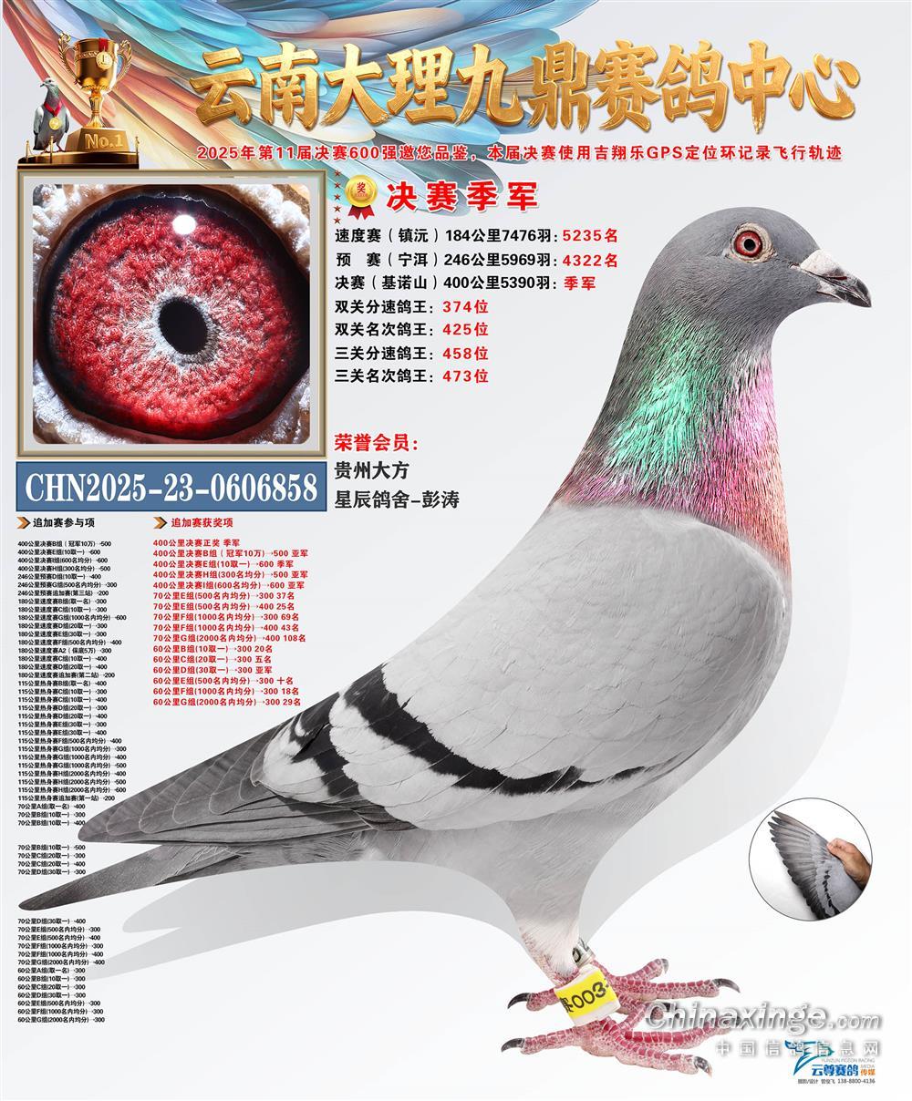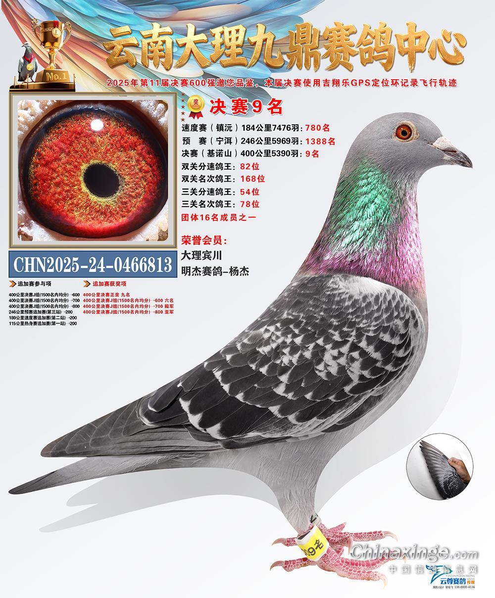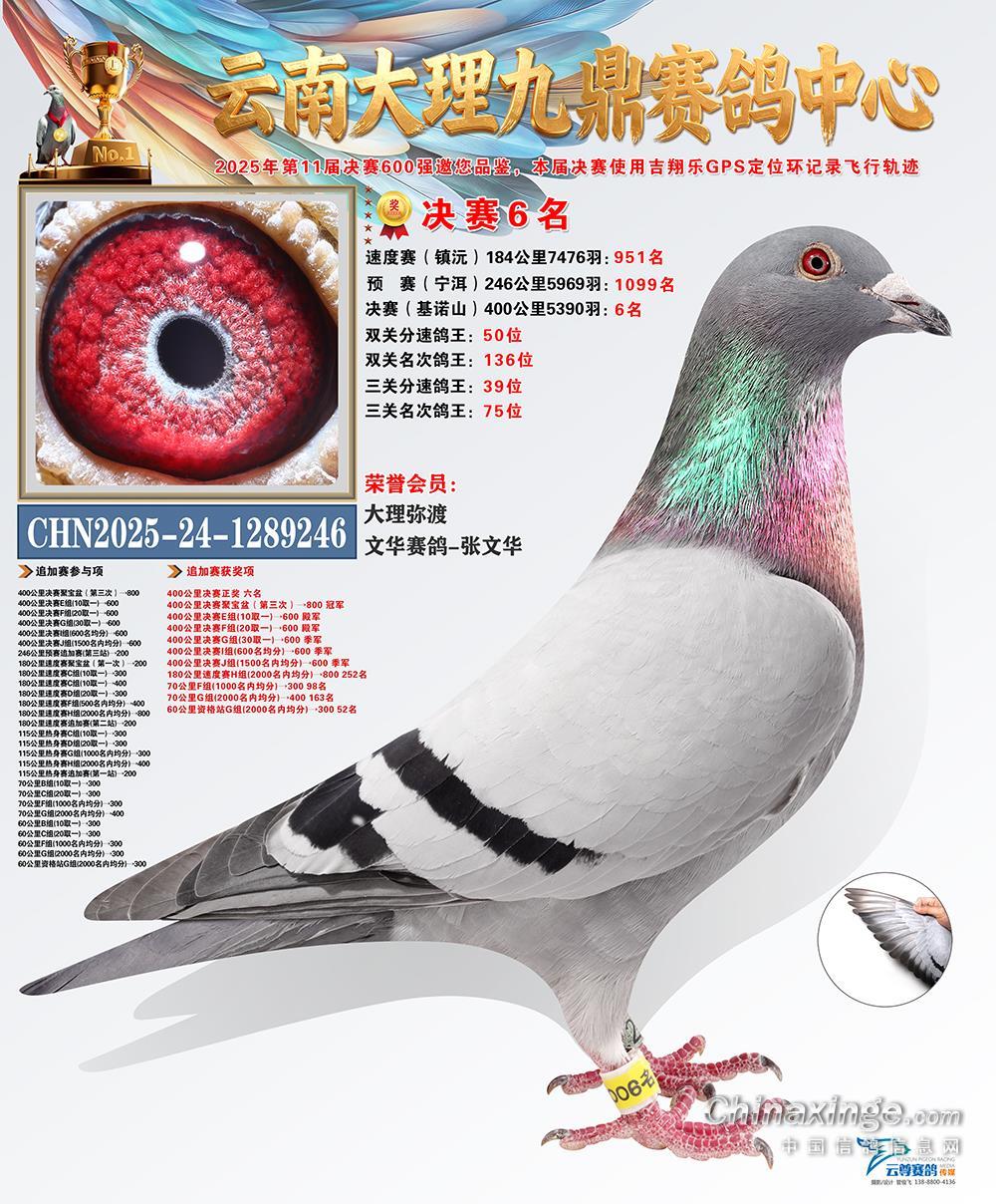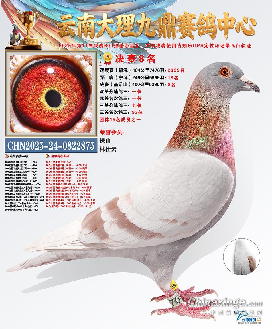 关关试炼砺好鸽,场场拼搏真英雄。云南九鼎赛鸽中心2025年秋赛已落下帷幕,作为已举办十一届比赛的老棚,九鼎赛鸽今年的秋赛可谓燃爆西南,不负众望!十一载深耕不辍、十一载口碑如金。从收鸽1.2万羽,到决赛归巢三千余羽,全程精彩无限。最终鸽友赢玺鸽苑-李学海麾下一羽2025-24-1495413灰鸽,将本届决赛冠军荣耀收入囊中!同时,这羽灰鸽凭借速度赛72名,预赛202名,决赛冠军的优异表现,荣耀加冕三关鸽王冠军,双冠在手,实力非凡!九鼎始终以专业立棚、公平为魂的初心,全程智慧眼监督,决赛配对定位脚环,努力办好赛事,在彩云之南的红土高原上,书写着赛鸽运动的热血。