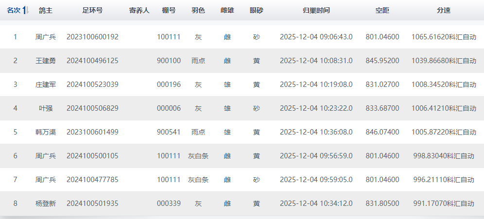 10时08分,鸽友王建勇麾下一羽2024100496125成功报进,拿下亚军!这是一羽黄眼雨点雌鸽,空距845公里,分速1039.8668米/分。