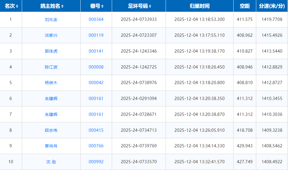 下午13时18分,鸽友刘兆金的一羽2025-24-0733933报进,空距411.575公里,分速1419.7708米/分,斩获冠军!