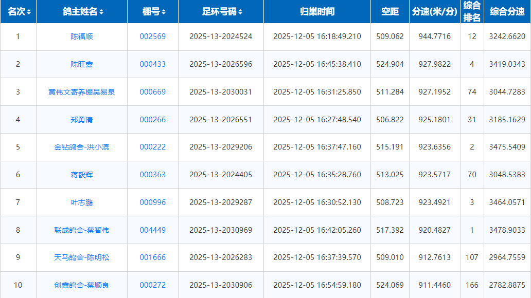 16时18分,鸽友陈福顺的一羽2025-13-2024524打钟归来,分速944.7716米/分,空距509公里,斩获决赛冠军,同时荣获三关鸽王12名的殊荣。
