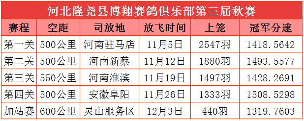 关关砺羽志愈坚,博翔小将再出征!12月3日,河北博翔俱乐部加站赛开赛,于灵山服务区准时开笼,参考空距600公里。冠军于当日15:05:21报进,是来自吕三的黄眼雨点雌鸽,环号03-2025-0370367,飞行空距599.580公里,平均分速1319.7603米/分。此鸽领先亚军十分钟归巢,实力不俗。至此,第三届“博翔杯”圆满落幕。
