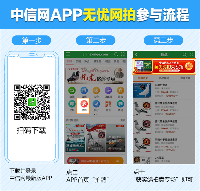 鸽王就等你来拍!河北隆尧博翔赛鸽俱乐部2025年秋季决赛获奖鸽将在中国信鸽信息网开启“纯网络拍卖服务”,所有鸽友可使用电脑或手机登录中信网出价,享受足不出户参与竞拍的便利和刺激!网上拍卖火热来袭,并于12月19日-21日依次结拍,敬请关注及参拍。