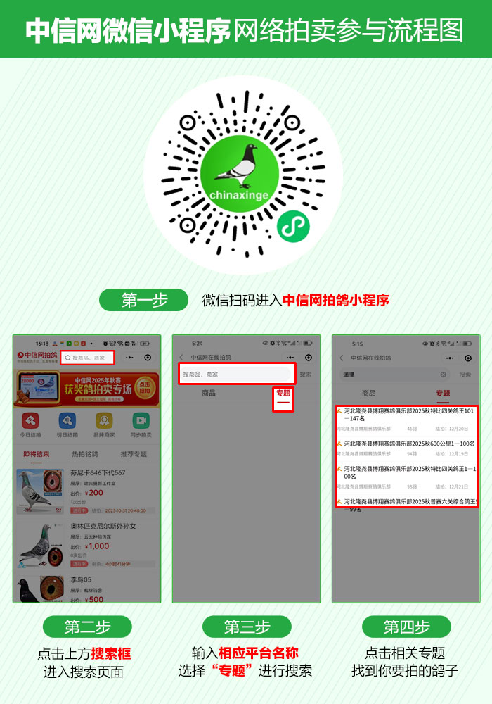 微信识别下方二维码进入中信网拍鸽小程序搜索“隆尧博翔”秒速参拍哦!