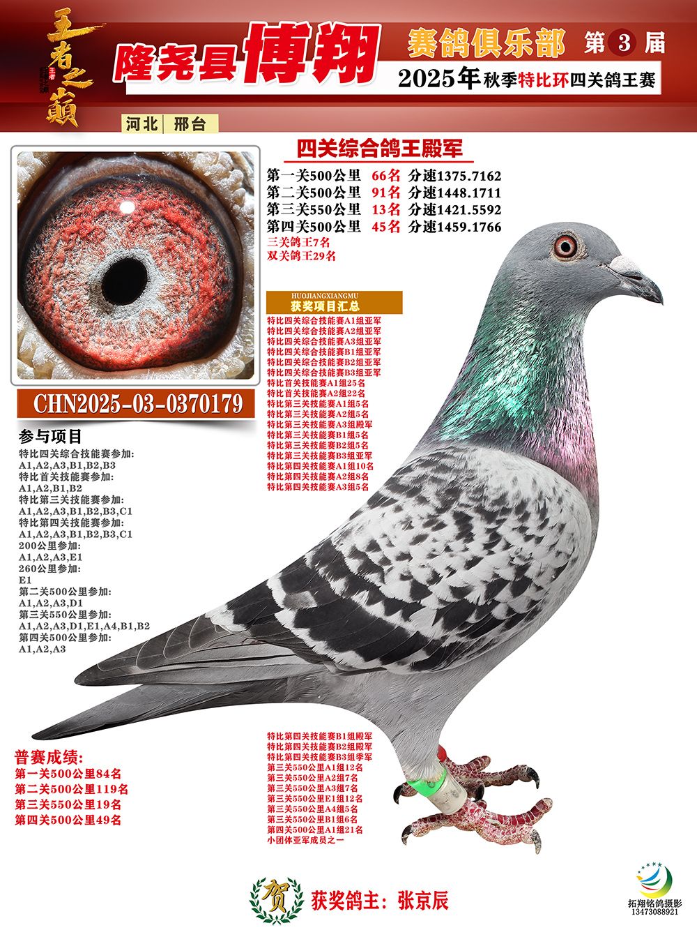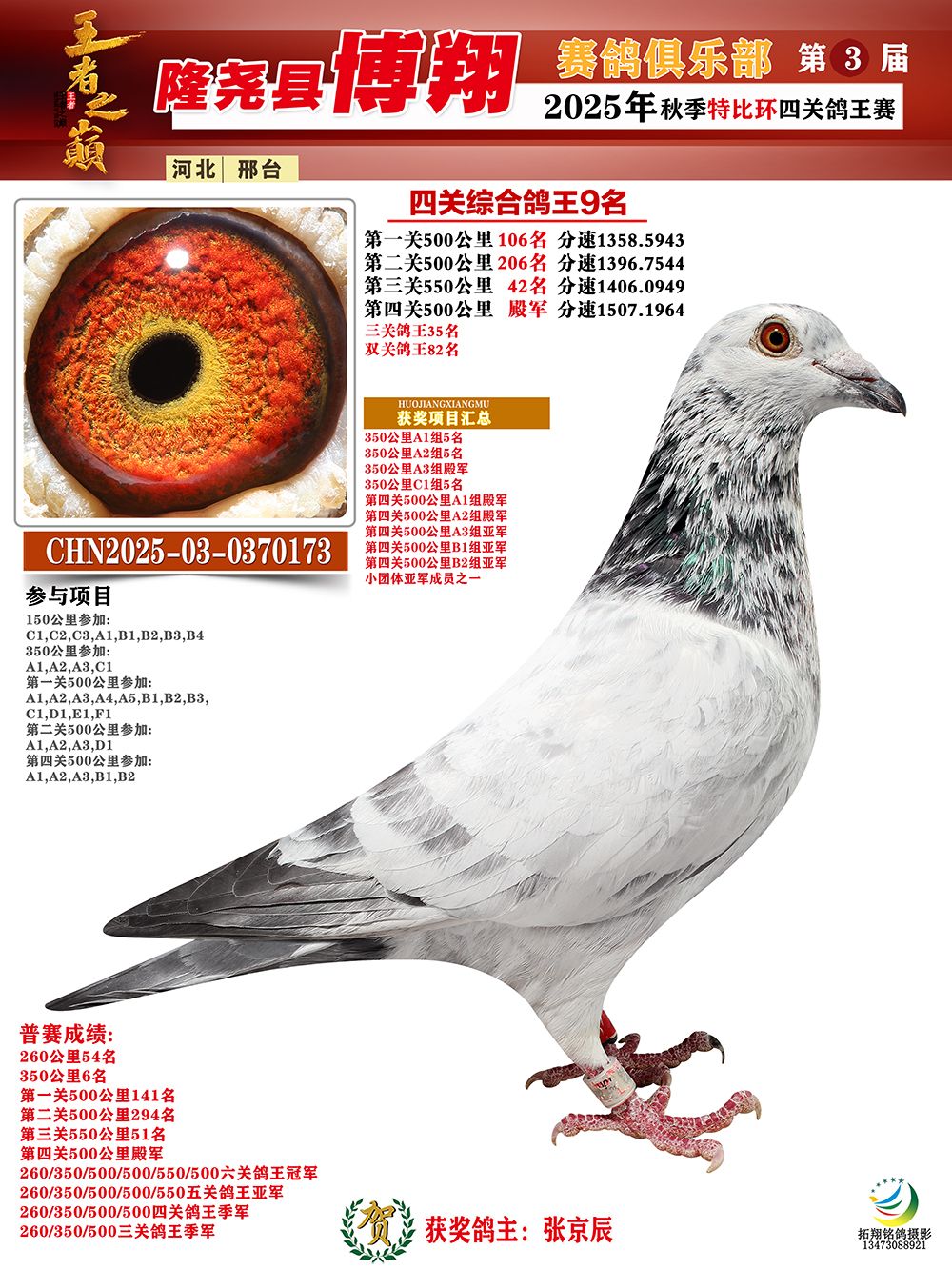 回顾本届赛事,最大赢家非张京辰鸽友莫属!他不仅斩获四关特比鸽王季军,更一举摘得六关普赛鸽王冠军,双项重量级大奖,荣耀满载,其名下2025-03-0370173麒麟花,六关平均分速1387.7100米/分,以首关54名、二关6名、三关141名、四关294名、五关51名、六关殿军,揽获六关鸽王冠军大奖。同时,其另一羽2025-03-0370157雨点,为他捧回四关特比鸽王季军奖杯。另外,在11月26日决赛中,张京辰鸽友的四羽赛鸽几乎同时归巢,包揽冠、亚、季、殿军!四将横扫赛场,尽显王者之师风采。