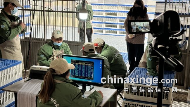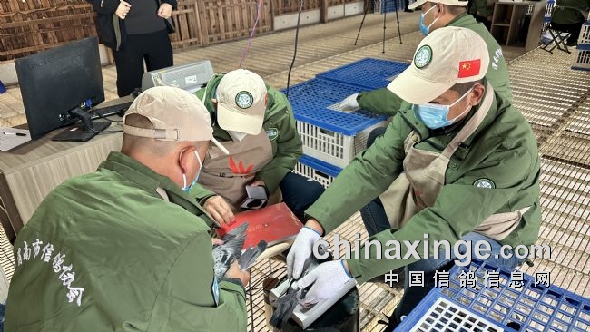 本场赛事集鸽工作严谨认真、正常有序,一丝不苟。经过裁判员逐羽检查参赛鸽足环,核对电子环信息,检查鸽子状况,盖暗章等。从下午13:31分至21:25分,总计集鸽7136羽。