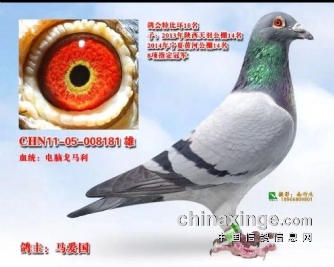 2014年,马爱国用电脑戈马力雄鸽与引进的一羽公棚500公里决赛冠军桑杰士雌鸽配对,作出了宁夏黄河公棚500公里决赛14名,2016年作出了宁夏黄河公棚500公里冠军、双关、三关鸽王亚军;2017年此配对作出了宁夏黄河五关鸽王7名,2018年作出了北京惠翔300公里9名,2019年作出了内蒙古翔盛公棚500公里决赛26名,2021年北国之春小秋棚500公里决赛29名……