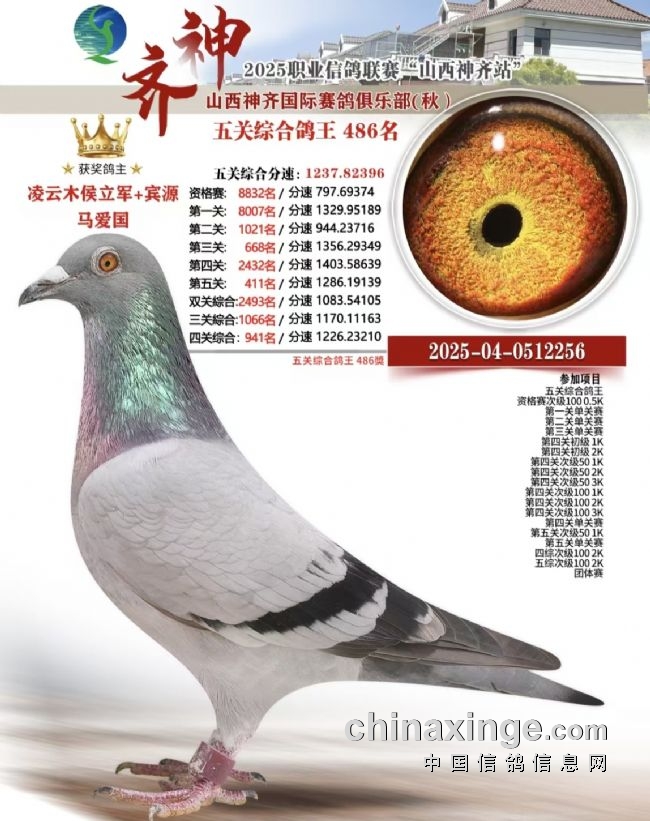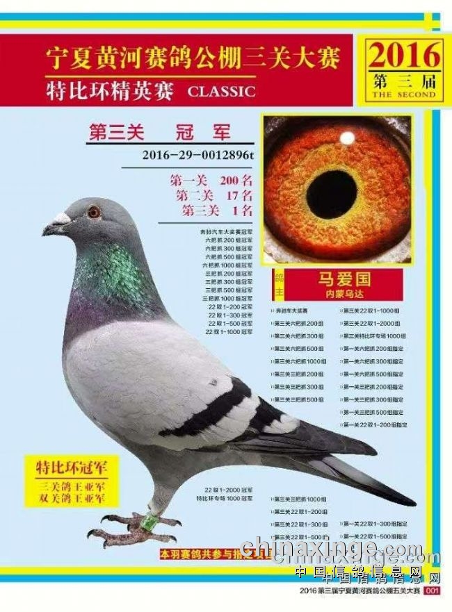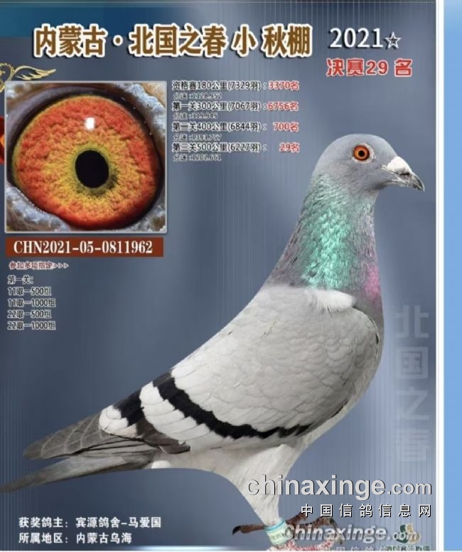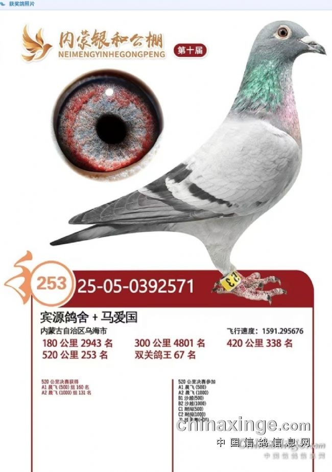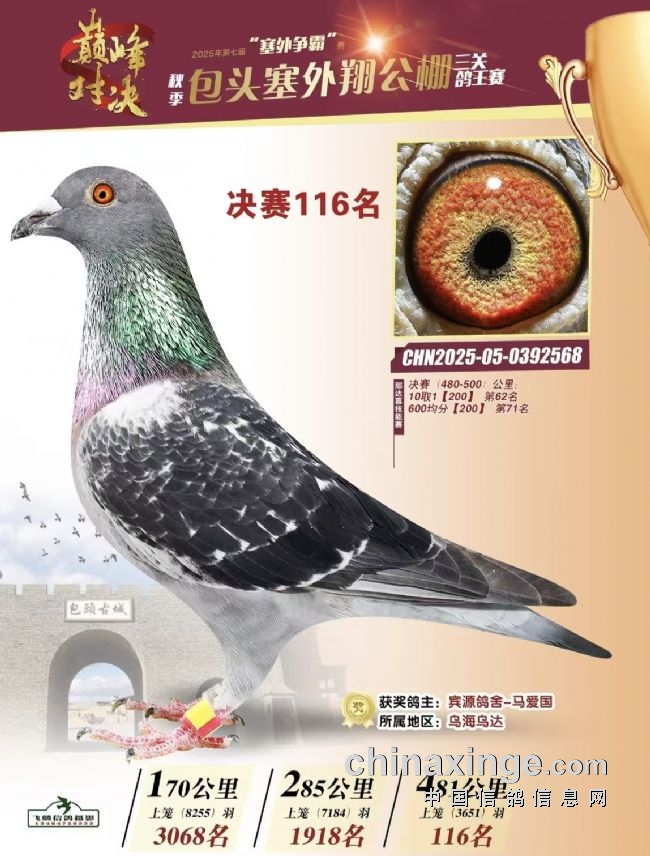 2025年,马爱国用电脑戈马力雄鸽与引进的凡登布克雌鸽杂交,作育出的子代分别在内蒙古呼和浩特银河公棚和包头塞外翔公棚入赏。获得银河公棚420公里338名、520公里253名,包头塞外翔285公里132名、481公里256名……