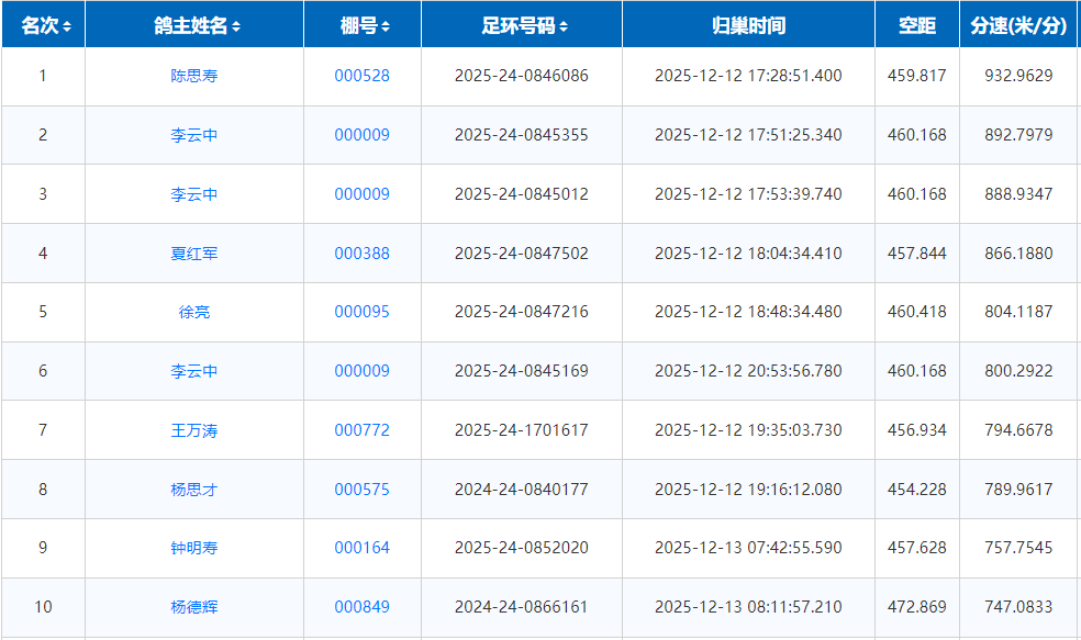冠军由鸽主陈思寿拿下,赛鸽环号2025-24-0846086,于开笼当天17时28分51秒成功归巢。冠军鸽实际空距459.817公里,分速932.9629米/分,成为当日最早归巢鸽,表现突出。