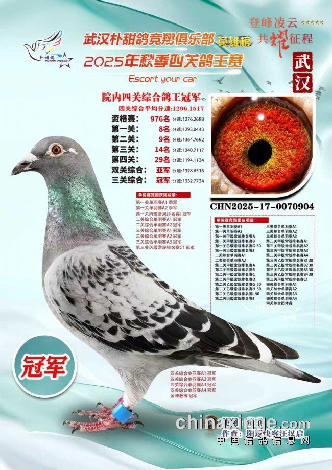 武汉朴甜鸽竞翔俱乐部,2025年秋季四关鸽王赛,院内四关综合鸽王冠军,