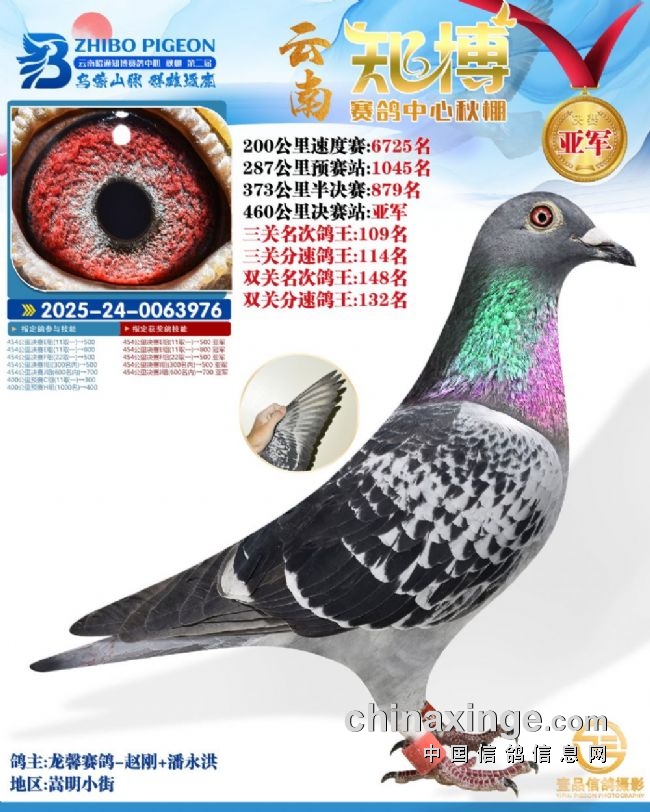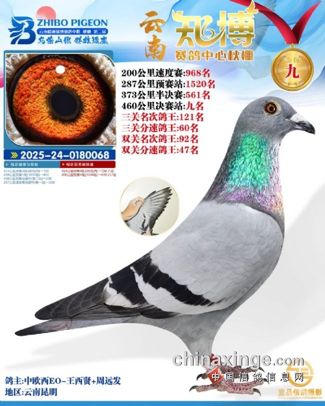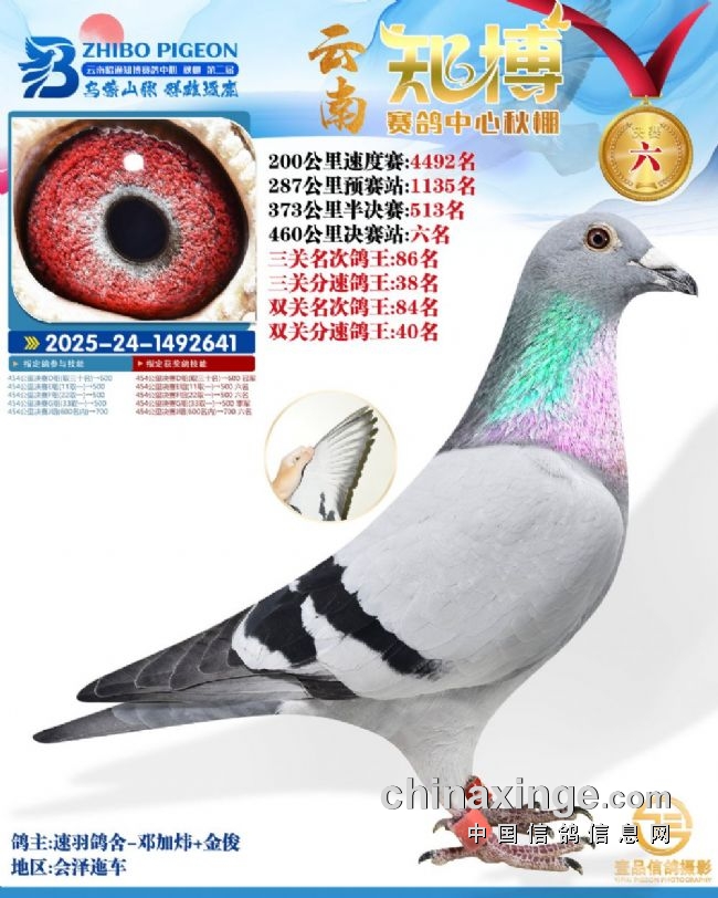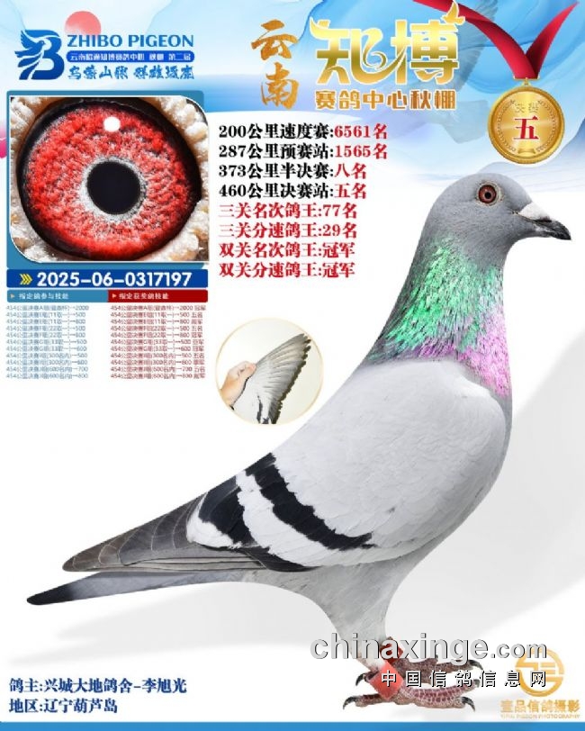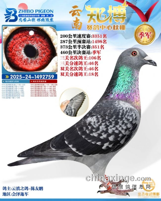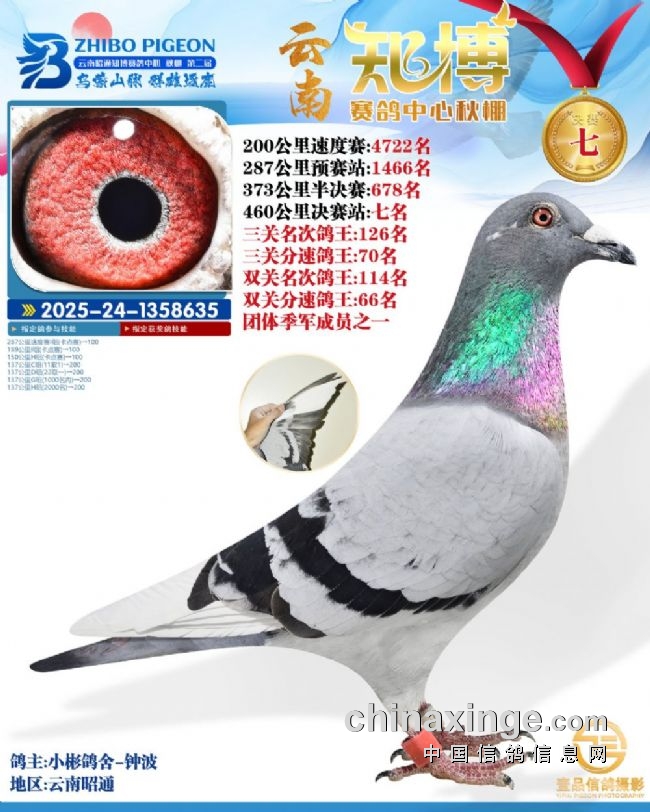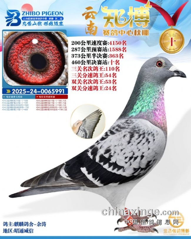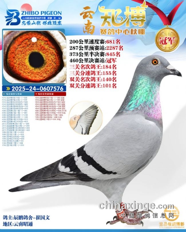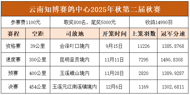 云南知博赛鸽中心2025年秋第二届秋赛,给鸽友们交上了一份满分答卷。本届三关赛为300+400+450公里赛制,在地形复杂、天敌遍布的云南,已经是难得的挑战和勇气。9月15日,40公里资格赛,九成归巢率,顺利拿下开门红。11月11日,300公里速度赛率先打响,7295羽赛鸽展开比拼,本关十分具有挑战性,仅有不到四成赛鸽完成挑战。第二关预赛,江鹏赛鸽-刘坤良的2025-24-0032738灰夺冠,分速1389.9287米/分。决赛辰鹏鸽舍-崔国文的2025-24-0607576灰夺冠,分速1302.6811米/分。