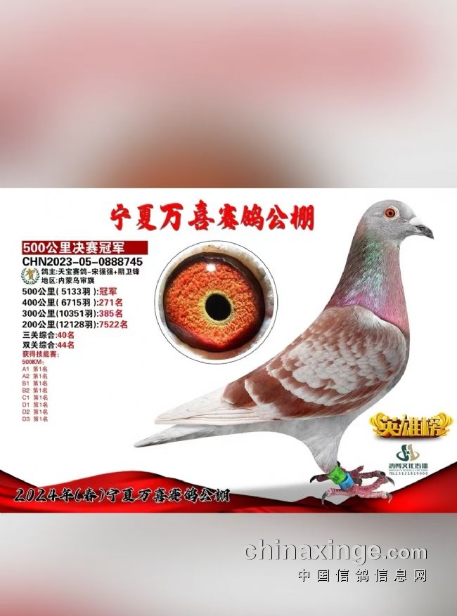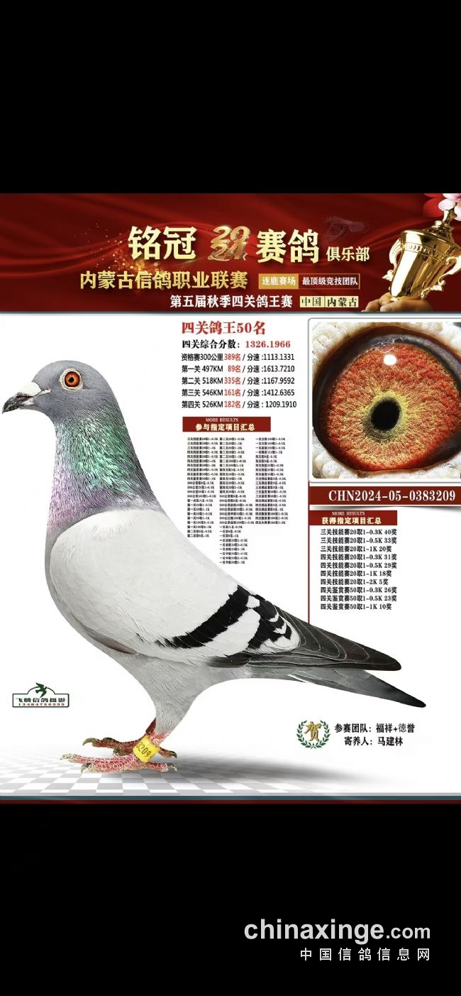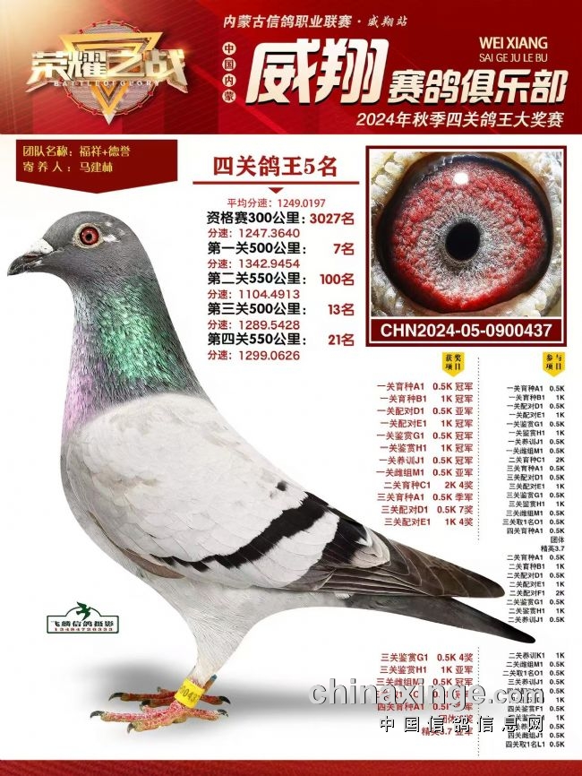 2024年,又获得包头威翔俱乐部四关鸽王5名精英赛亚军,赢得奖金一百多万,君翼公棚四关鸽王冠军,赢得奖金50多万,额尔多斯铭冠俱乐部四关鸽王50名,赢得奖金50多万等。今年在平罗鸽会获得第四关590公里单关5名,8名,四关鸽王13名,19名等,鸽会特比环第四关团体亚军,一步步成长为平罗鸽坛的青年领军人物。