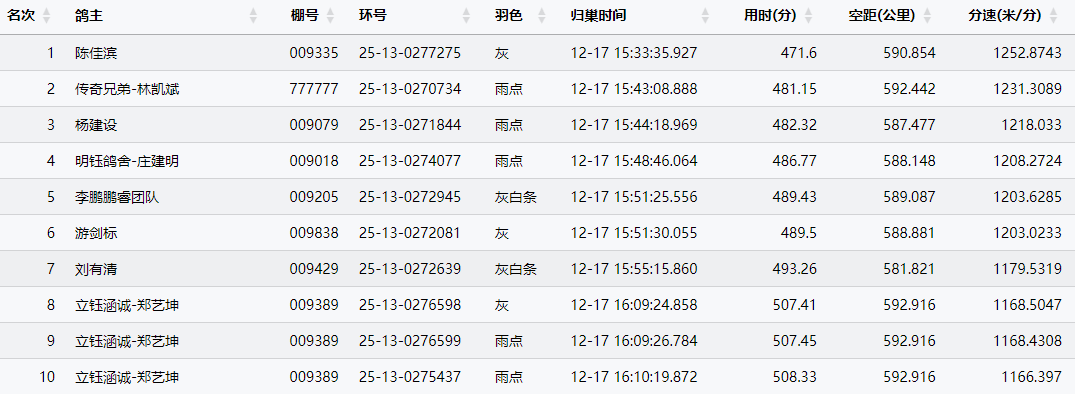 十分钟后,15时43分,传奇兄弟-林凯斌的25-13-0270734雨点鸽报进,其飞行空距592公里,平均分速1231.3089米/分,斩获亚军;15时44分,杨建设的25-13-0271844雨点鸽以1218.033米/分的分速位列季军。