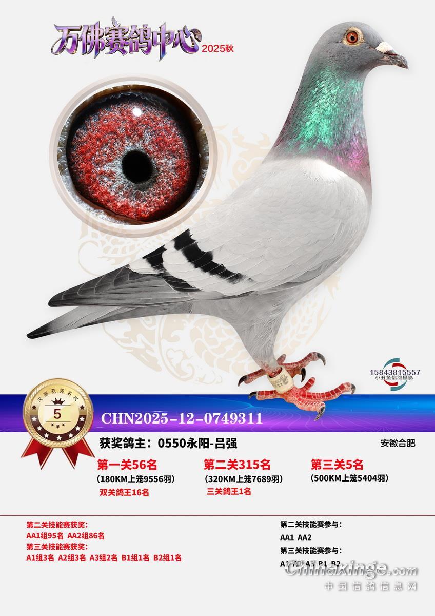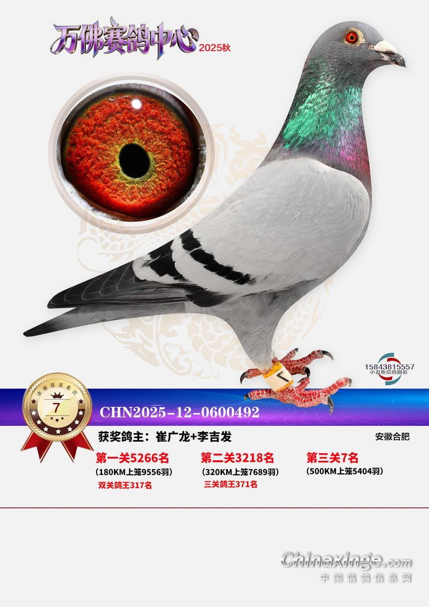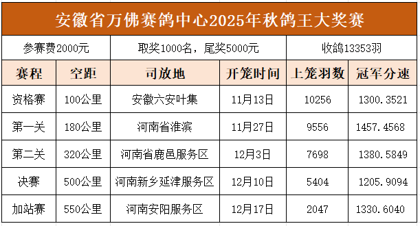一流管理,三公竞赛,已经有十余年办赛经验的安徽省万佛赛鸽中心,在2025年秋季大奖赛中,交出了一份让鸽友们满意的答卷。关关高分速,场场高归巢。万佛小将们的基本功,在一场一场的训练和比赛中练的扎扎实实。三关战罢,0550永阳-吕强的12-0749311灰实力强劲,三关名次分别为56名、315名、5名,不仅在决赛挺进前十,更是获得了三关鸽王冠军,可喜可贺!鸿冠鸽苑-李春平的12-0169008灰,双关成绩为46、56名,获得双关鸽王冠军。决赛冠军是上古时代-汪加虎的12-0527663,飞行分速1205.9094米/分。