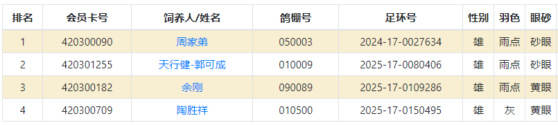 鸽友周家弟的2024-17-0027634雄雨点砂眼,09:09:25打钟归巢,飞行分速894.6630米/分,目前暂居亚军;