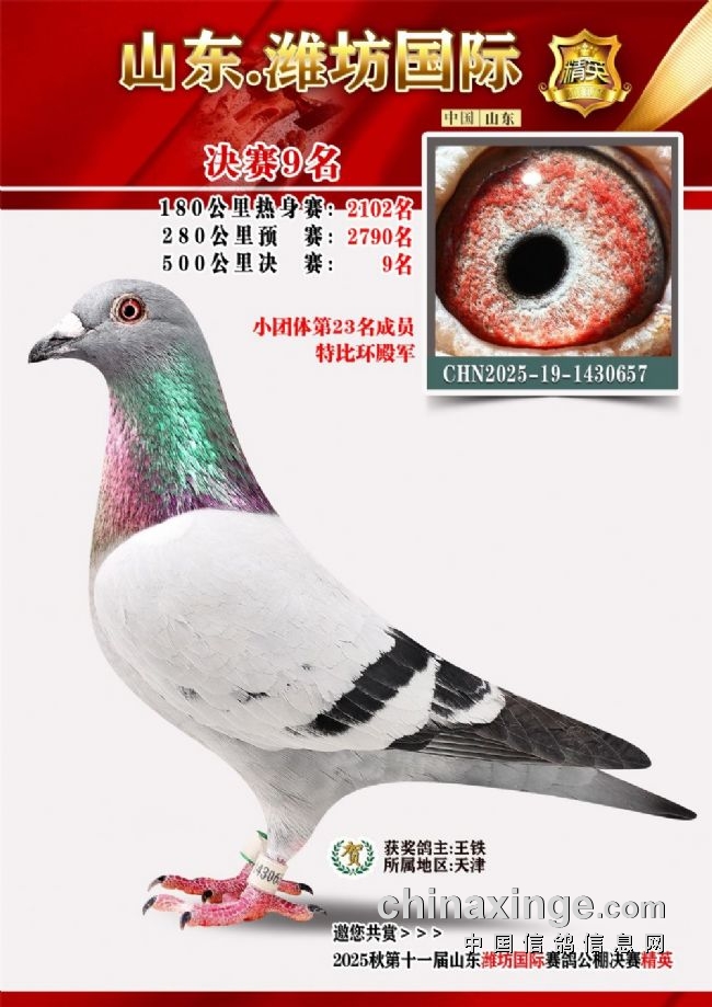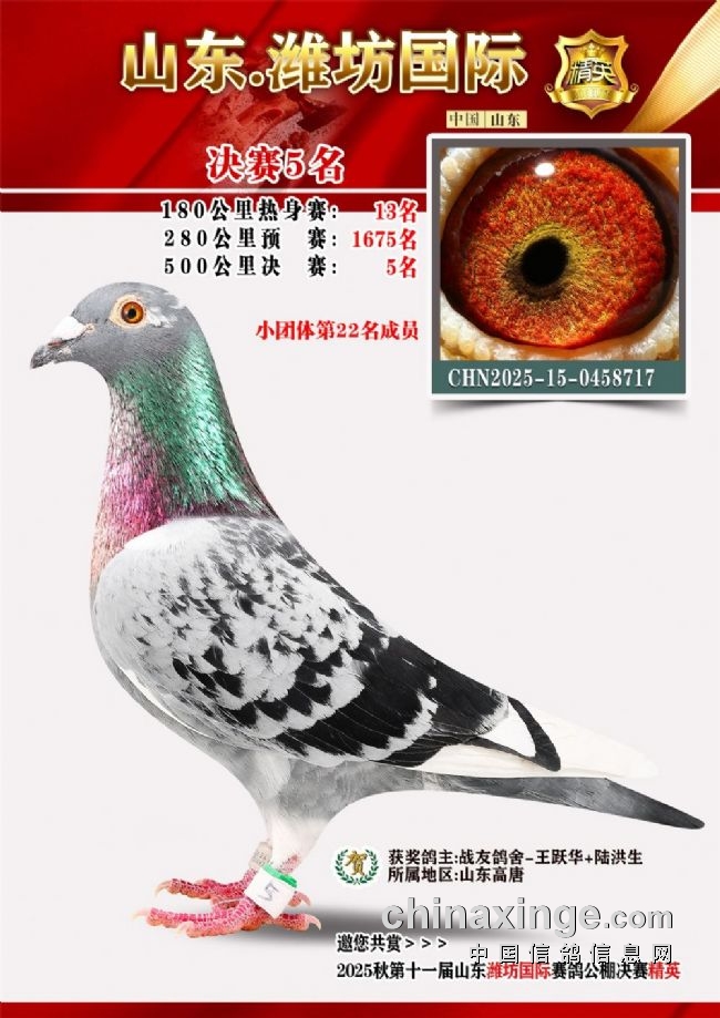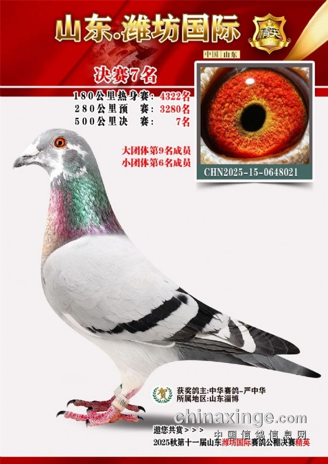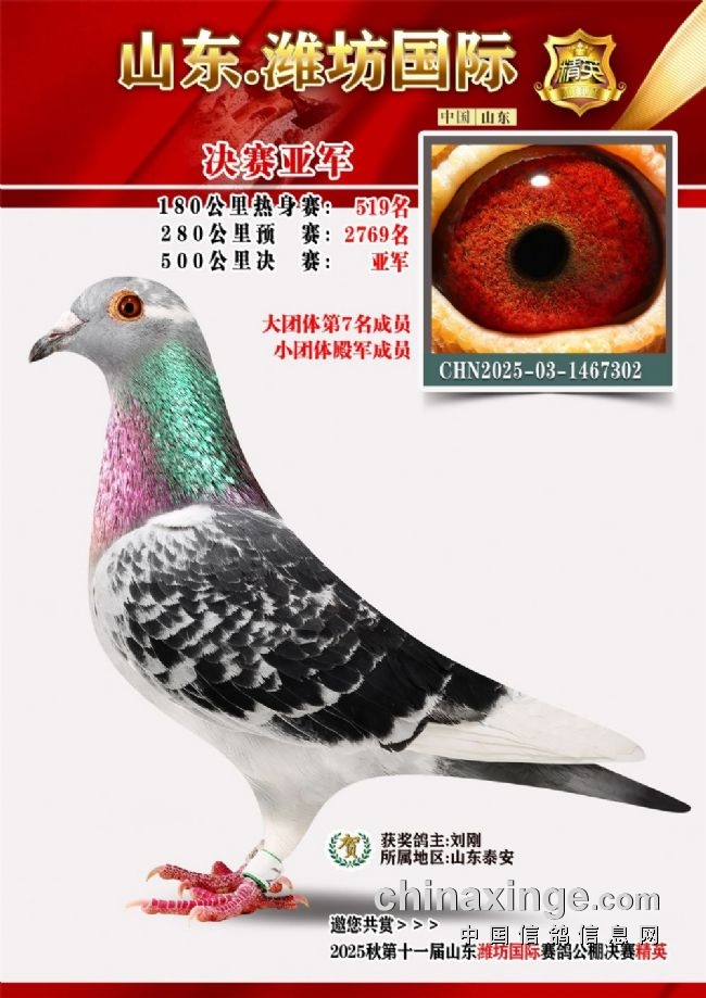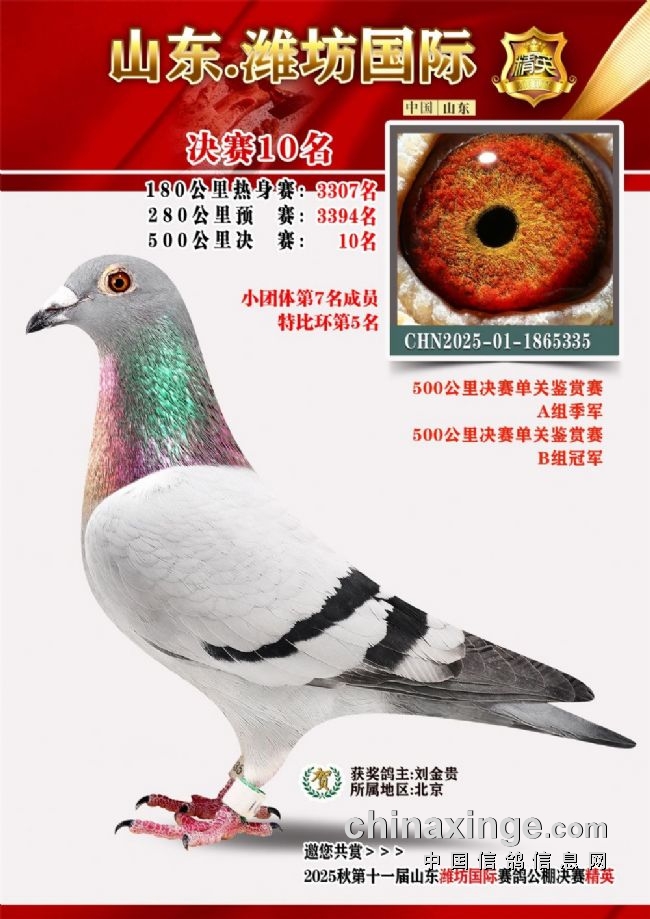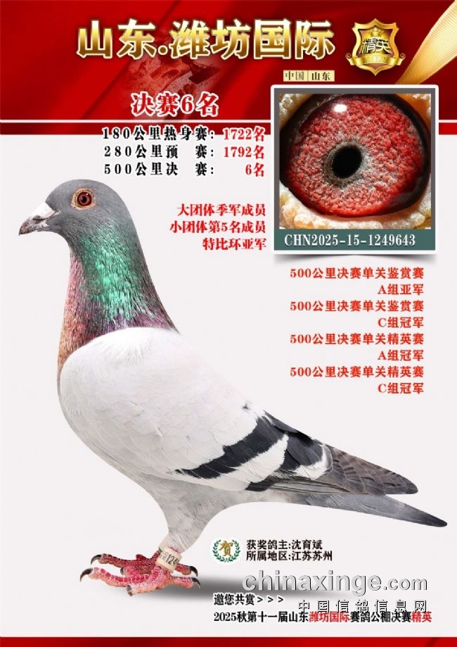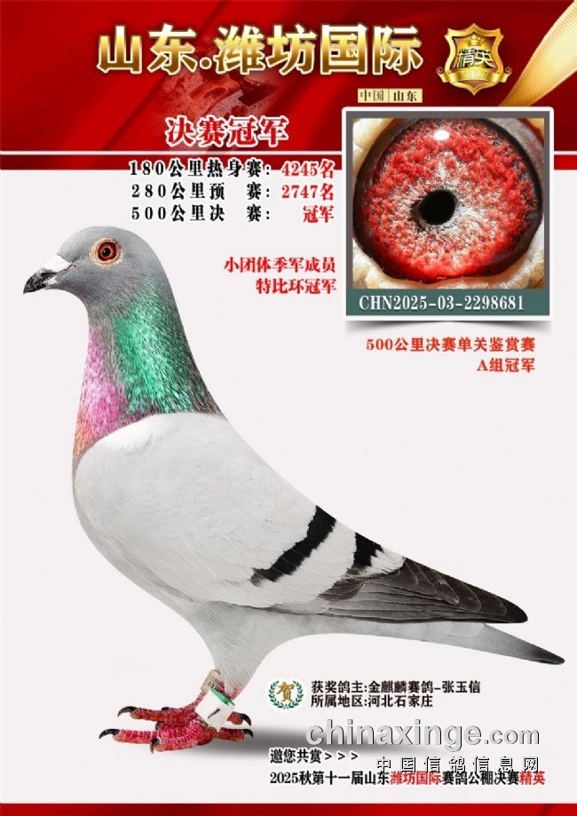精收精养精训,强练强赛强兵!山东潍坊国际赛鸽公棚第十一届秋赛展示了老牌公棚的实力:存棚率高,收鸽6032羽,百公里收费站上笼5019羽,存棚率高达83%;赛鸽耐力好,三关正赛打完还有加战赛和千公里联赛,共180+280+500+560+1000公里的路程,不怕飞的赛鸽才是好赛鸽!首关180公里,归巢率超九成轻松拿下。二关280公里中,超七成赛鸽顺利归巢。11月28日决赛开启,金麒麟赛鸽-张玉信的一羽2025-03-2298681灰以1495.7145米/分的分速拿下全场冠军,同时也是小团体季军、特比环冠军。