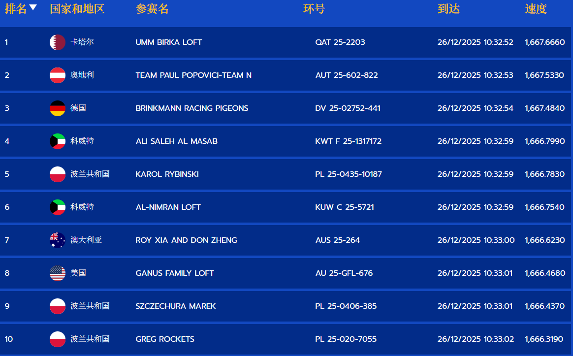 前十席位中,美国鸽友甘纳斯跻身第8名,波兰共和国三位鸽友闯进前十,分别获得第五、第九、第十;科威特两位鸽友强势突围,拿下第四、第六的好成绩。