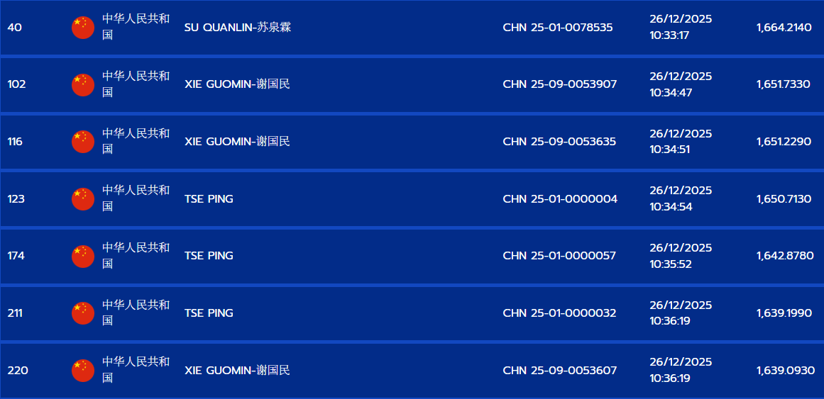 此外,另有4羽中国赛鸽入围前两百,分别是鸽友谢国民的CHN25-09-0053907(102名)、CHN25-09-0053635(116名),鸽友谢炳CHN25-01-0000004(123名)、CHN25-01-0000057(174名)。本次赛事共22羽中国参赛鸽进入前五百。
