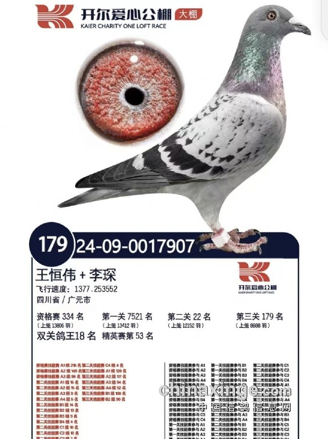 上海偞翔代表性种鸽:大开尔决赛179名、双关鸽王18名胞妹