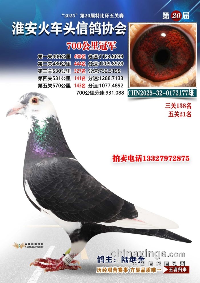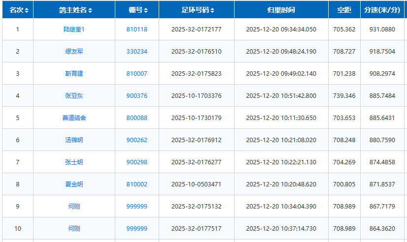 冠军:陆继奎名下2025-32-0172177,于次日9:34:34报进,飞行空距705.362公里,平均分速931.0880米/分。
