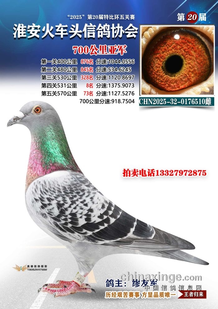 亚军:缪友军名下2025-32-0176510,于次日9:48:24报进,飞行空距708.727公里,平均分速918.7504米/分。