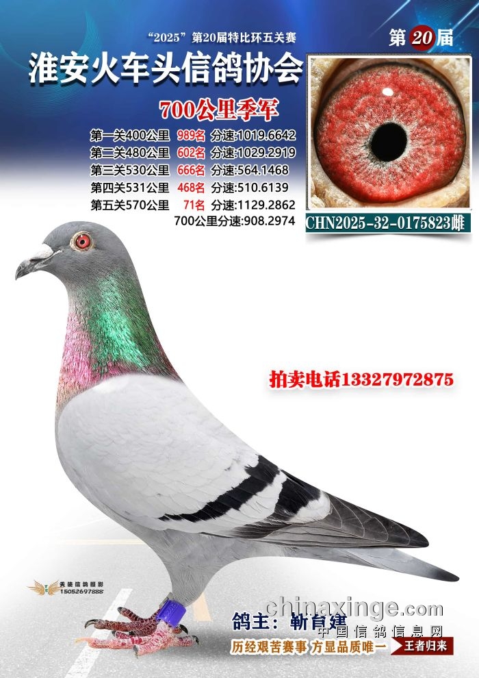 季军:靳育建名下2025-32-0175823,于次日9:49:02报进,飞行空距701.238公里,平均分速908.2974米/分。