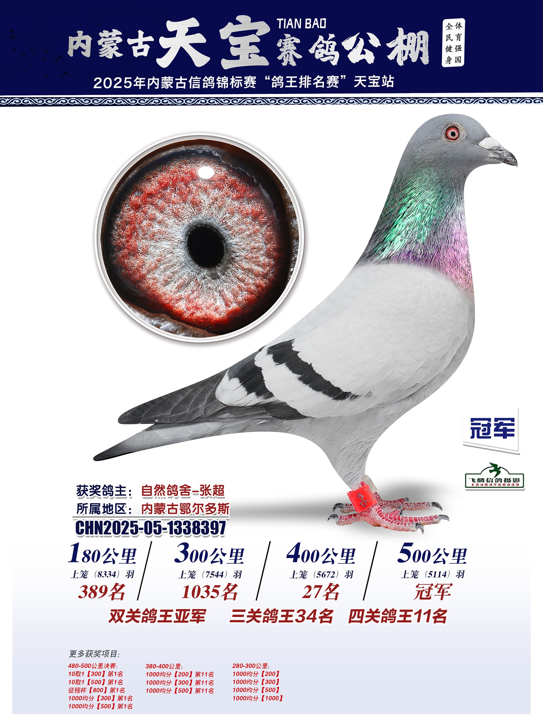 11月19日,天宝秋棚第二届500公里秋决赛在陕西蓝田鸣枪,实际空距498.511公里,参赛羽数高达5114羽。自然鸽舍-张超名下的灰鸽(2025-05-1338397)以1291.0536米/分的速度勇夺桂冠。此鸽前几关表现起伏明显:首关第389名、二关第1035名、三关跃升至第27名,最终在决赛中完成惊艳逆转。更值得一提的是,它同时斩获双关鸽王亚军及四关鸽王第11名,为主人捧回多项重量级荣誉,堪称全能型战将。