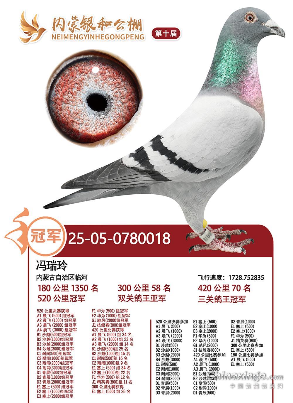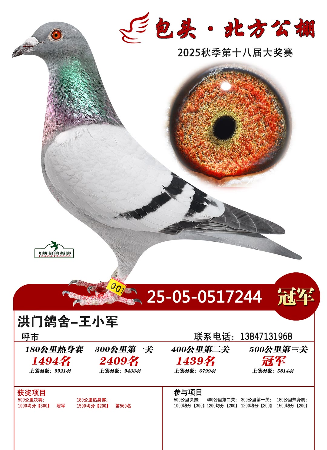 金秋十月末,2025年包头爱亚卡普公棚秋季三关鸽王大奖赛落下帷幕。从300公里资格赛起步,经400公里预赛淬炼,再到500公里终极决战,至决赛日仍高达7300余羽参赛!在这场硬战中,一羽来自上海鸽友邱扣锁麾下的灰鸽(2025-09-0159978)如利剑出鞘,以资格赛第18名、预赛第265名、决赛高居第6名,一路稳定而强势表现,最终力压群雄,勇夺三关鸽王总冠军!