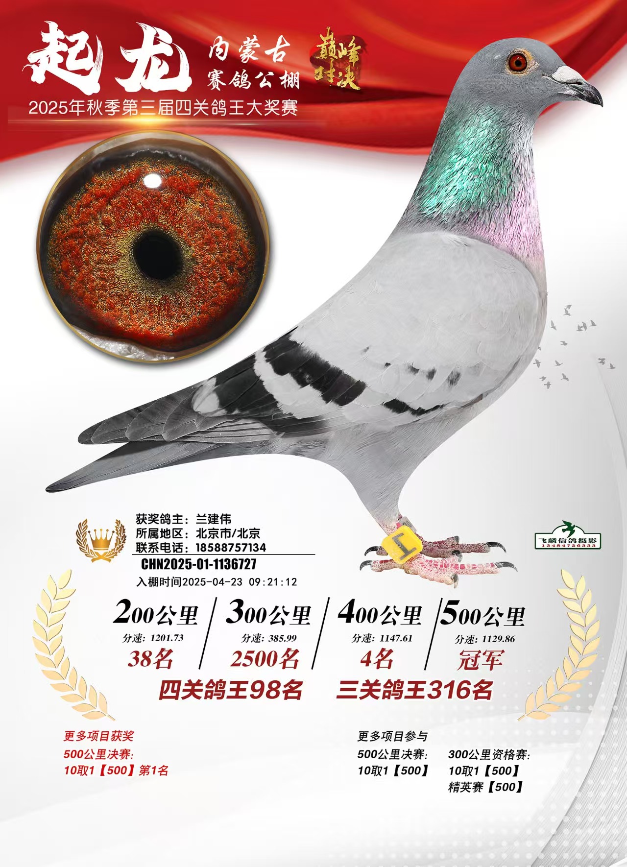 11月28日,包头起龙公棚第四关500公里秋决赛于太仆寺旗开笼,参赛羽数2015羽。兰建伟鸽友名下的灰鸽(01-1136727)以1129.8563米/分的平均分速勇夺桂冠。此鸽全程表现稳健而强势:200公里首关第38名、300公里二关虽位列第2500名,却在400公里预赛强势崛起,一举斩获殿军;最终更在500公里决赛中登顶冠军。三关均飞进前百,含金量十足,堪称一羽经得起多轮考验的实战型强鸽。