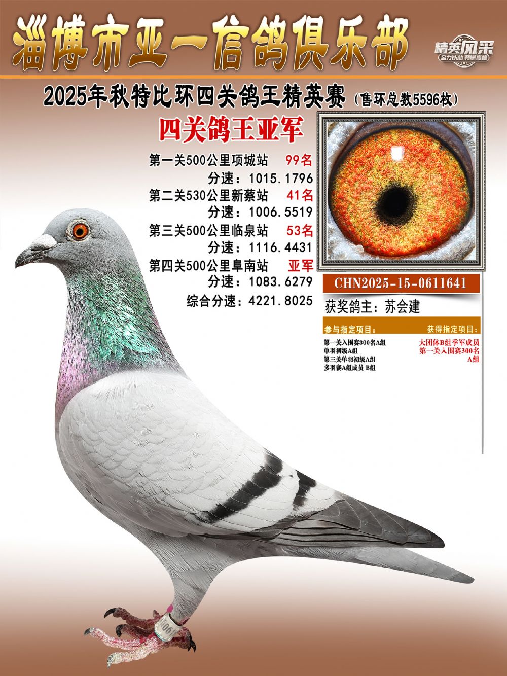 2025年11月18日,山东淄博亚一信鸽俱乐部2025年秋季四关鸽王大赛圆满落幕。本届赛事共售环5596枚,历经四关高强度、高难度的激烈角逐,最终仅有120羽赛鸽成功完赛,期间上演了一场场精彩的长空对决。