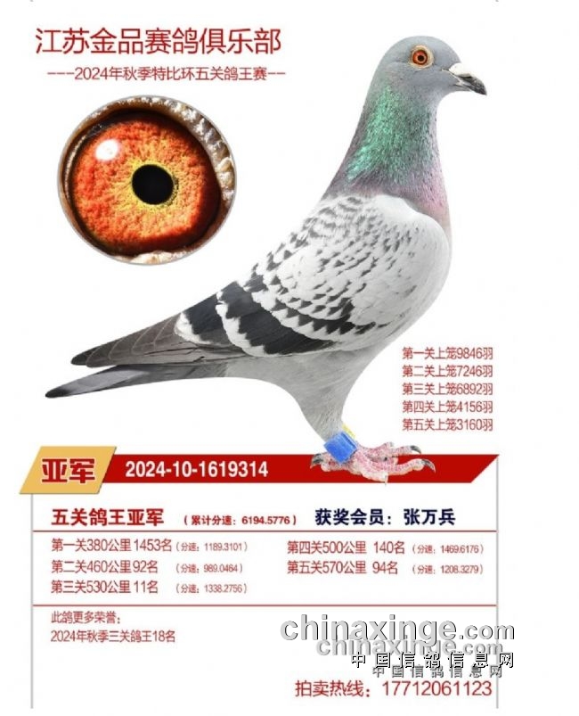 本报讯:近日,江苏金品俱乐部2025年特比环五关赛圆满落幕,鸽主张万兵名下的凡代克•所向无敌血统鸽再次展现超凡实力,勇夺五关鸽王季军。这羽传奇战将继2024年斩获五关鸽王亚军和殿军后,2025年再创佳绩,用连续两年的优异表现证明了自己不仅是中距离赛场的速度王者,更是多关稳定发挥的不败战神。