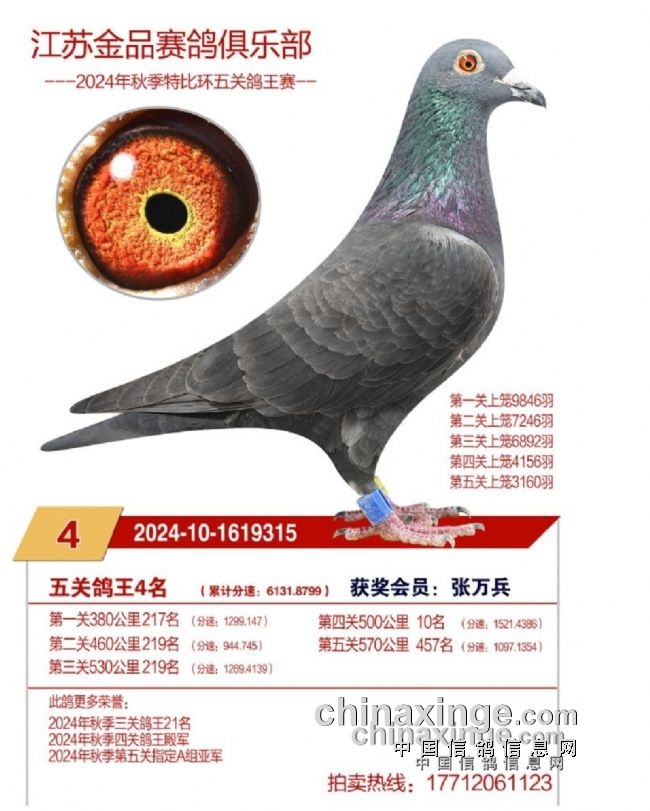 进入2025赛季,这羽战将延续了上佳状态,在江苏金品俱乐部特比环五关赛中再次脱颖而出,斩获鸽王季军。连续两年在五关鸽王赛中稳居高位,充分证明了其血统的稳定性和竞翔能力的卓越性。