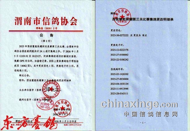 2026年1月6日早上08:39,西安慧能秋棚第三关400公里比赛在山西平遥古城开笼,实际空距382公里。6062羽慧能勇士斗志昂扬征战,角逐本关100个有奖席位。截至比赛当晚,共归巢2860羽,当日归巢率达47.17%。比赛险中取胜!