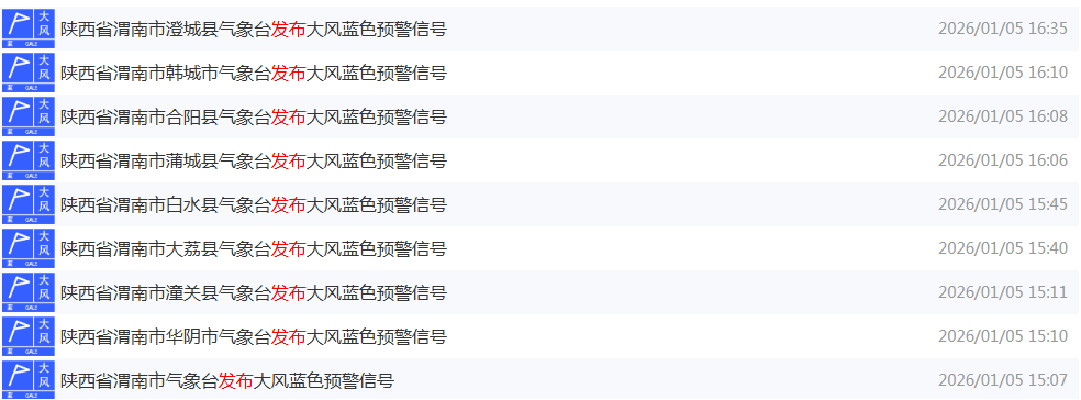 渭南市气象台2026年1月5日15时07分继续发布大风蓝色预警信号:预计下述地区未来24小时内将受大风影响,平均风力4-5级,阵风6级以上:韩城市、华阴市、华州区、潼关县、大荔县、澄城县、合阳县、蒲城县、白水县,请注意防范。