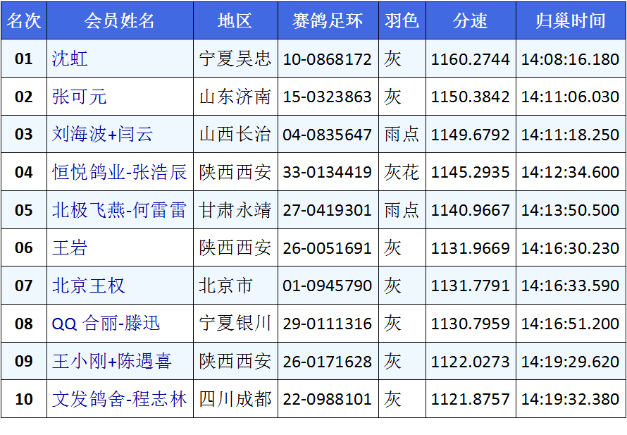 宁夏吴忠沈虹麾下10-0868172灰,以1160.2744米/分速摘取桂冠。