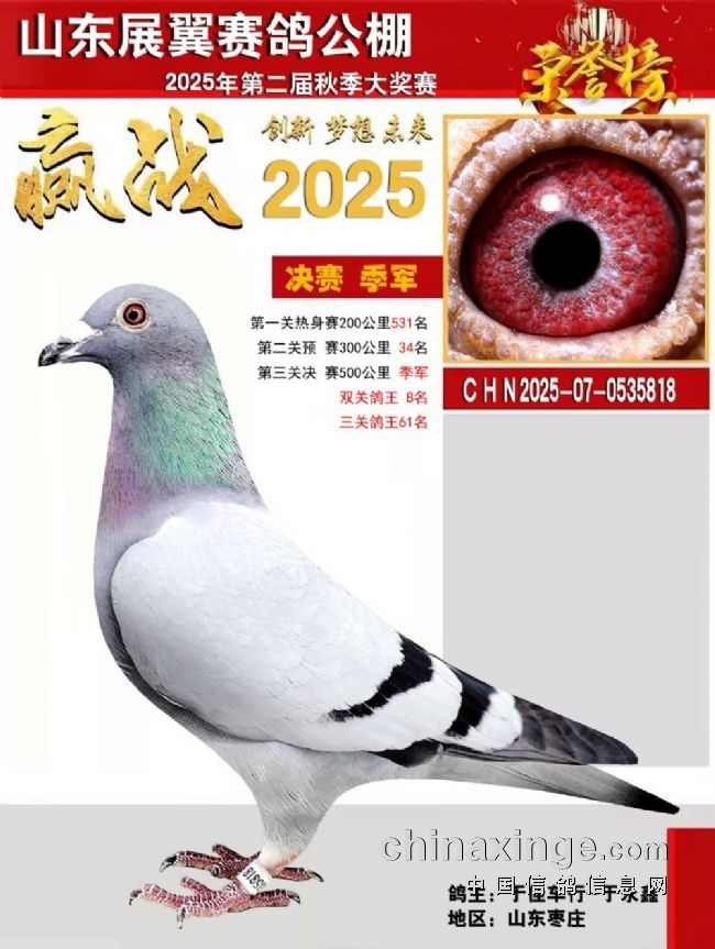 山东巨野鸽友张继伟的2025-15-1083329,在13:32:48打钟归巢,以1315.9567米/分的分速拿下决赛冠军。