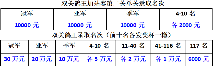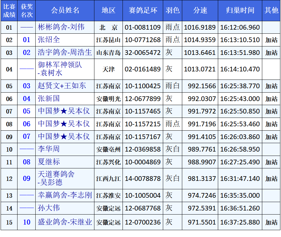 爱翔秋棚双关鸽王加站赛第二关550公里赛成绩TOP15、获奖TOP10
