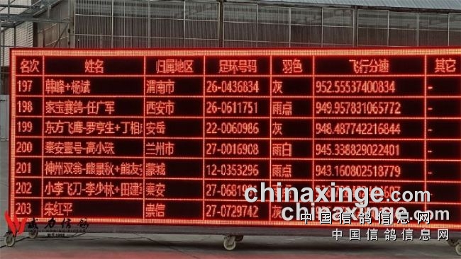 大屏幕显示:首豪赛鸽-孙铁柱19-0974412灰鸽以1051.7569米/分速夺得冠军;馨铖家园-王晓敏04-0969620灰鸽以1048.2379米/分速获得亚军;陕西蓝天-孙伟26-0154619雨点鸽以1047.2756米/分速获得季军。再次展现了威力优秀战鸽的品质,让每一羽战鸽再显英雄本色。