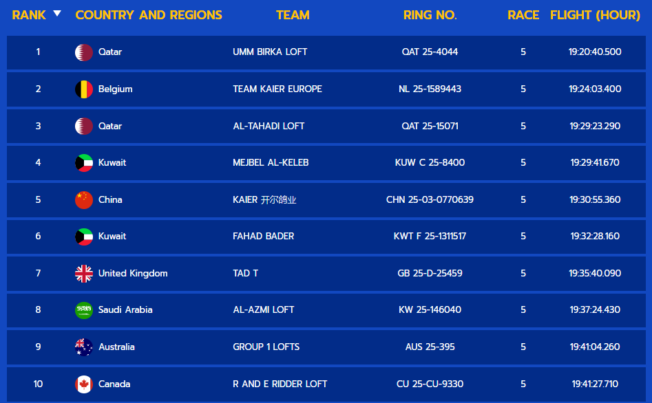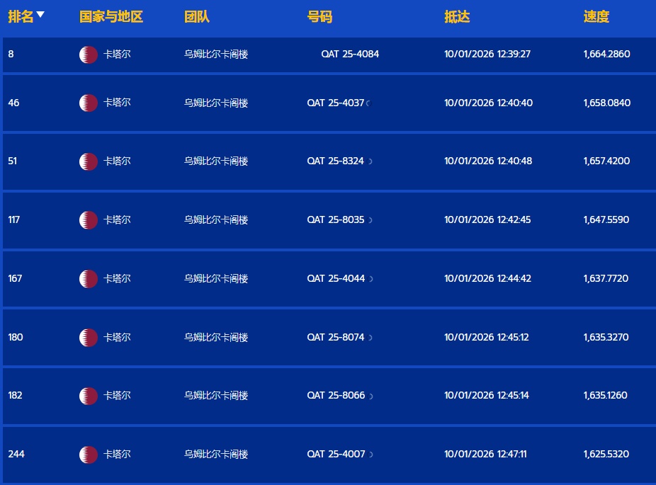 其中,卡塔尔强豪乌姆(UMM BIRKA LOFT)表现尤为亮眼:其名下环号 QAT 25-4084的赛鸽勇夺决赛第八名,另获得第46名、第51名、第117名等,多羽赛鸽跻身高位,整体发挥极为稳定。据统计,乌姆在资格赛中共上笼217羽,最终有16羽成功闯入决赛前500名。
