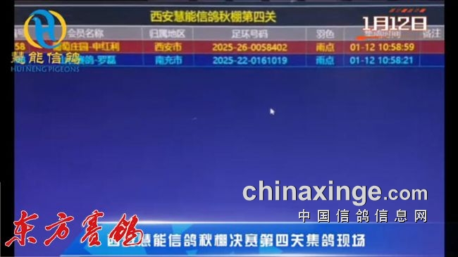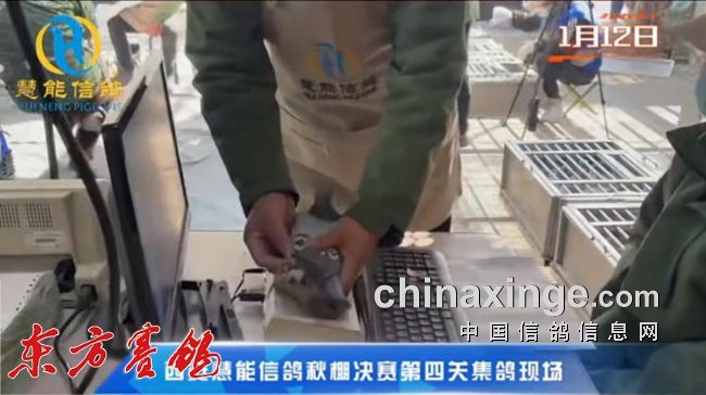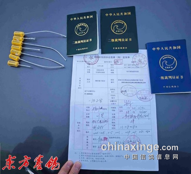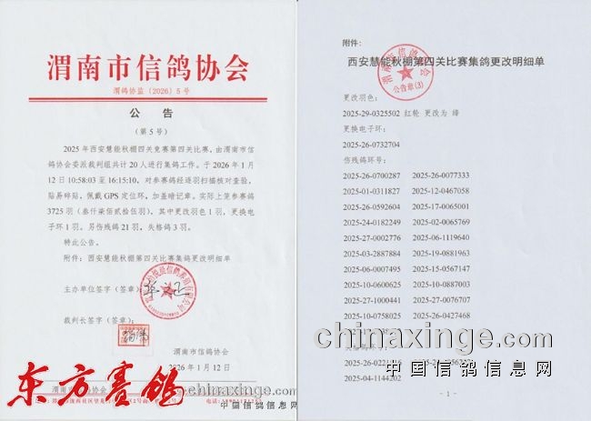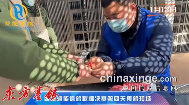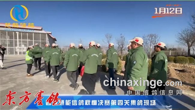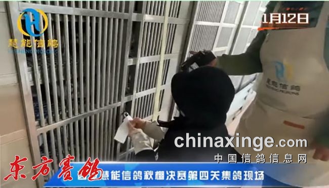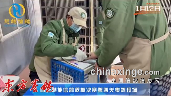 集鸽:1月12日集鸽,由渭南市信鸽协会委派裁判组共计20人执裁。集鸽于10:58:03开始至16:15:10结束,对参赛鸽逐羽扫描核对查验,贴易碎贴,佩戴由羽成达厂商提供的GPS定位环,加盖暗记章。剔除伤残鸽21羽、失格鸽3羽。实际上笼参赛鸽3725羽。其中,更改羽色1羽,更换电子环1羽。