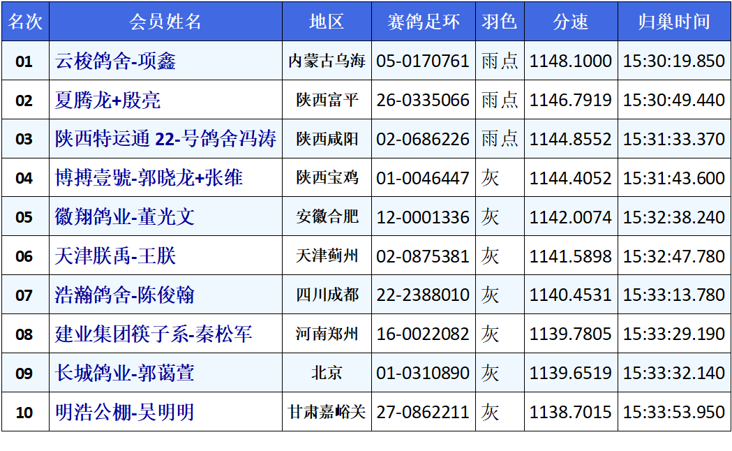 回说比赛。任风变幻无常,慧能勇士只认家的方向。抗住了早晨的寒冷,越过了千沟万壑,跨过了流淌着冰凌的黄河,经过7小时8分钟的风中漫步,15:26,首个冠军梯队3羽雨点飞临公棚上空,2分钟后第二梯队7羽抱团归来,先后落棚归巢排名次。用时3分34秒前十榜单出炉。