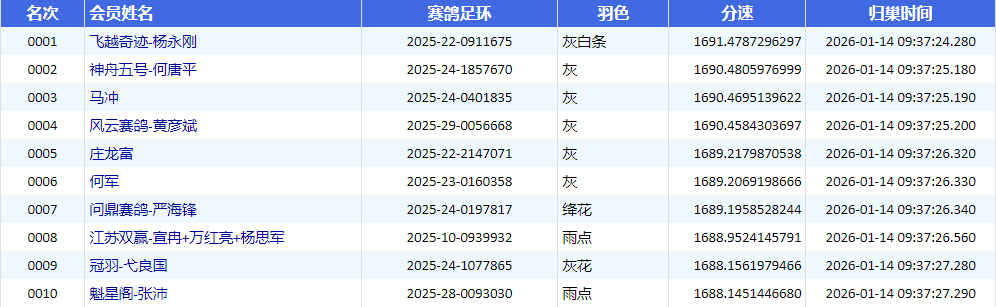 9时37分24秒,鸽友飞越奇迹-杨永刚的一羽2025-22-0911675灰白条率先报进,分速1691.4787米/分,夺得冠军。紧接着鸽友神舟五号-何唐平的2025-24-1857670,分速1690.4805米/分,获得亚军。鸽友马冲的一羽2025-24-0401835,分速1690.4695米/分,获得季军。截至1月15日上午9时,共归巢14365,归巢率98.18%。