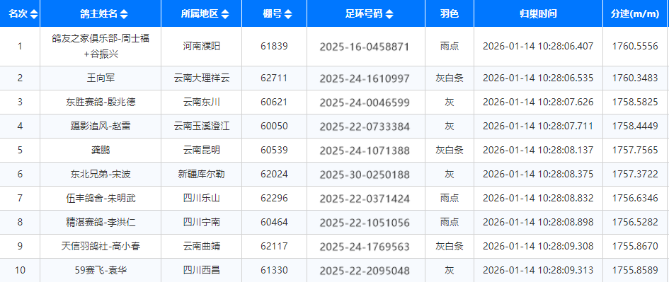 10时28分06秒,鸽友之家俱乐部-周士福+谷振兴麾下一羽2025-16-0458871雨点率先进棚踩钟,分速1760.5556米/分,获得冠军。鸽友王向军的一羽2025-24-1610997灰白条紧随其后,分速1760.3483米/分,获得亚军。鸽友东胜赛鸽-殷兆德的一羽2025-24-0046599灰鸽,分速1758.5825米/分,获得季军。截至1月15日上午9时30分,共归巢12862羽赛鸽,归巢率99.38%。