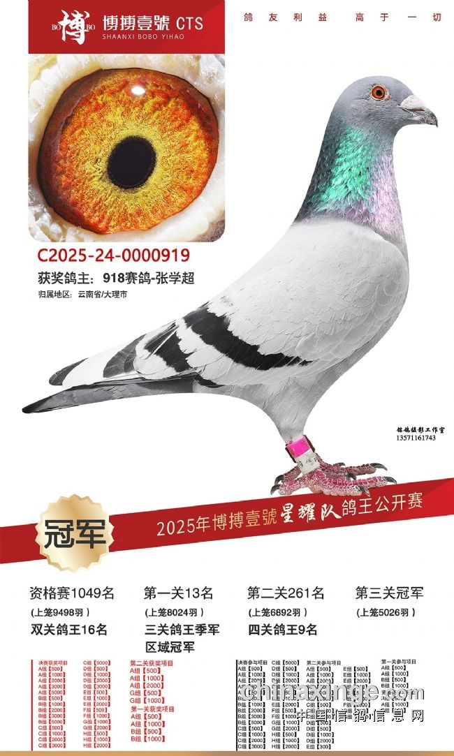 1月7日,博搏壹號CTS竞技乐园星耀队500公里决赛,在山西平遥县开笼,共集鸽5026羽。云南大理鸽友918赛鸽-张学超的2025-24-0000919灰白条,以1151.9897米/分的分速拿下冠军。