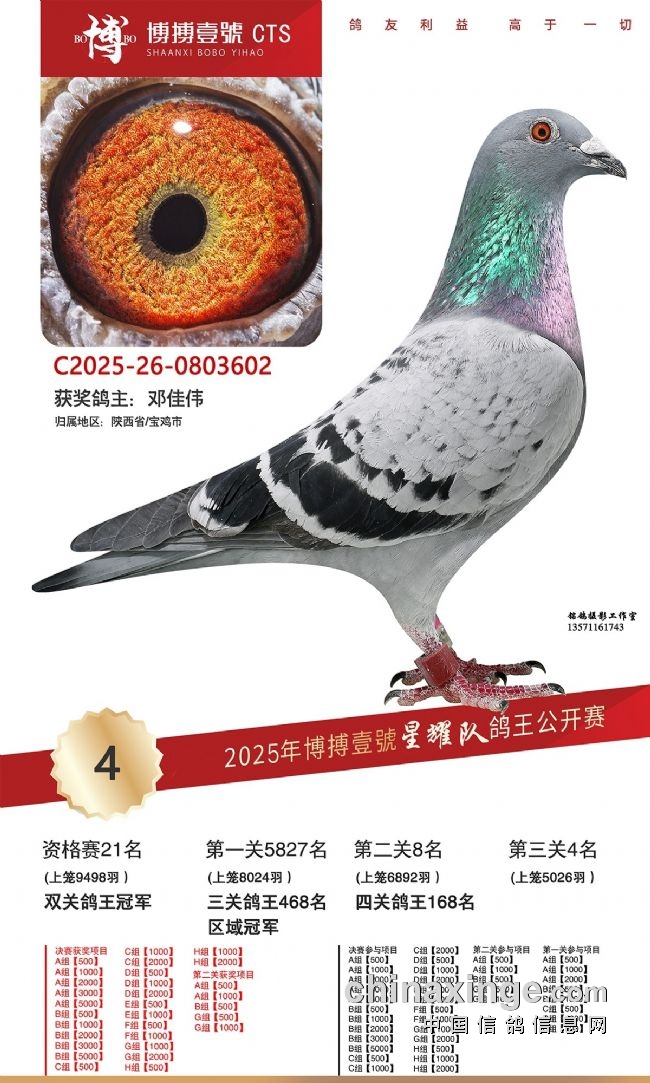 第二羽颇具看点的是陕西鸽主邓佳伟的一羽雨点。这羽赛鸽环号0803602,凭借资格赛21名、首关5827名、二关8名、决赛4名的好成绩,拿下了双关鸽王冠军。鸽主今年仅交鸽这一羽,谁知居然一路绿灯,拿下了如此优异的成绩,为鸽主赢得大奖。恭喜!