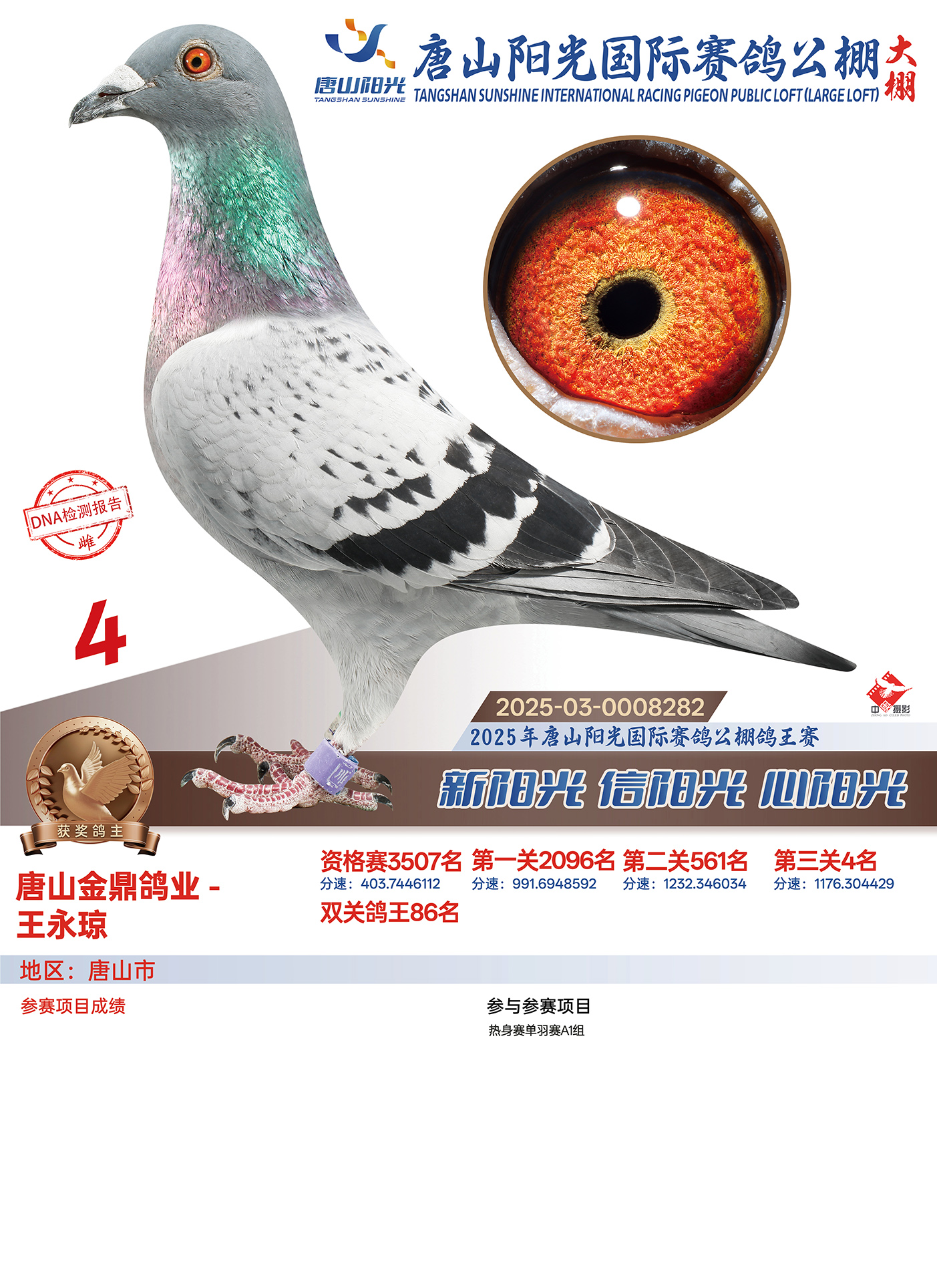 唐山实战强豪,唐山金鼎鸽业-王永琼今年在阳光大棚共交鸽2羽,但最后仅有一羽0008282通过收费站考验。而就是这羽8282,一路披荆斩棘,一关3507名、二关2096名、三关561名、决赛4名,状态越来越好、成绩也十分喜人,最终为鸽主拿下双关鸽王86名。