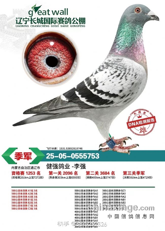 健强鸽业-李强的05-0555753雨点,来自内蒙古通辽市,获得决赛季军。资格赛上笼7272羽获1253名、一关上笼6593羽获2096名、二关上笼5747羽获3684名、决赛上笼4729羽获季军。可以说,是一位妥妥的黑马选手。
